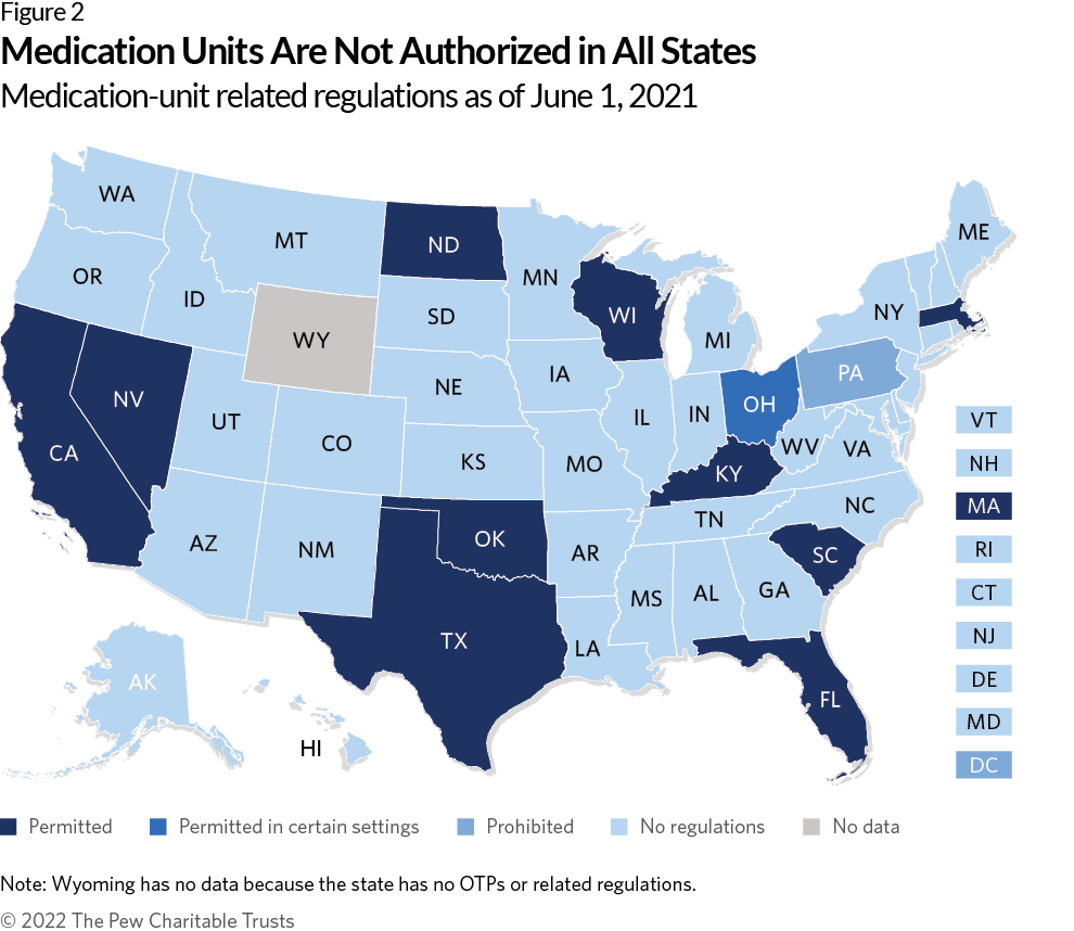 Eleven states explicitly permit medication units, while one— Pennsylvania—prohibits them. Ohio specifically allows medication units to operate in homeless shelters, jails, prisons, local boards of public health, community health centers, residential treatment providers, small counties, and counties in Appalachia.7