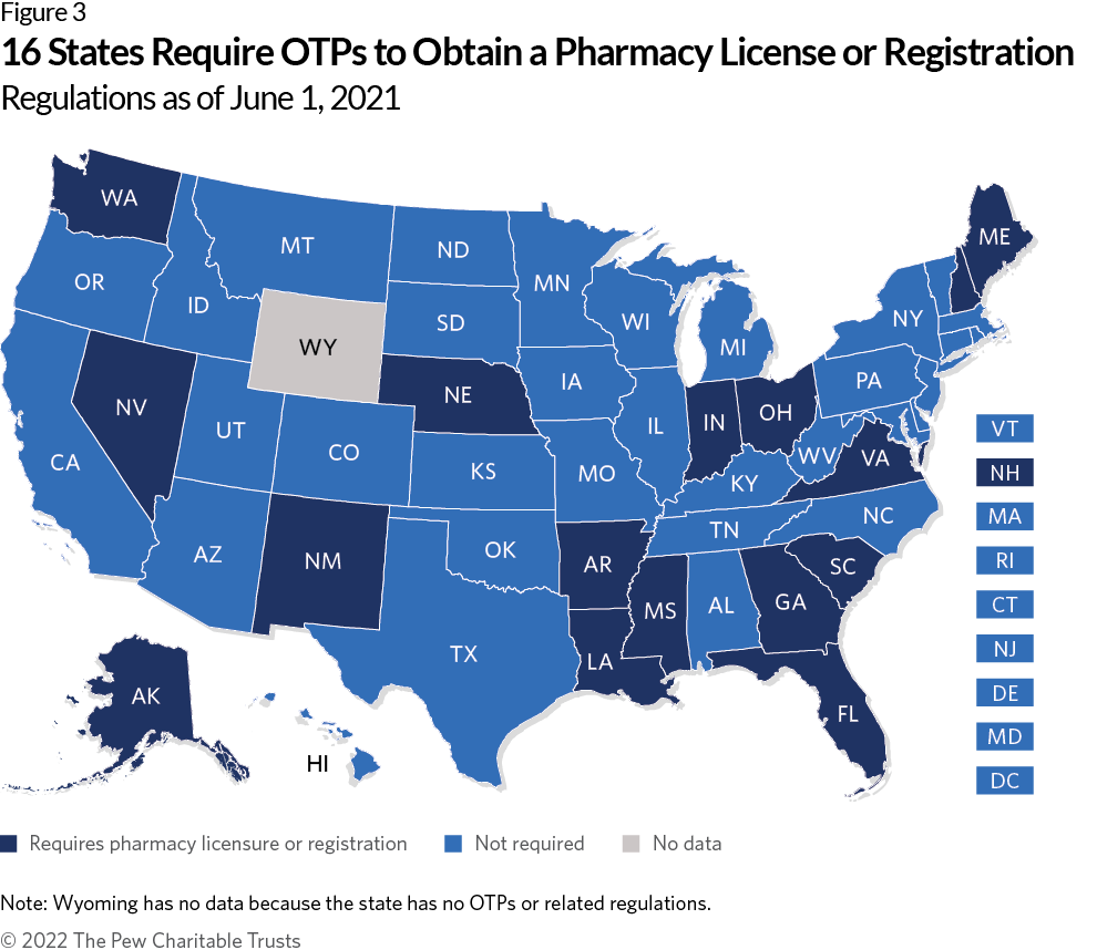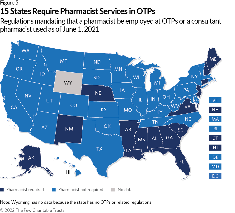 However, 15 states require OTPs to hire a pharmacist or a consultant pharmacist, who provides guidance on the appropriateness and safety of medication use.10
