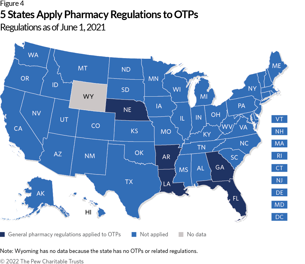 States that require OTPs to follow their general pharmacy regulations— which apply to a neighborhood drugstore that fills prescriptions for many medications that are used for multiple conditions—make establishing new OTPs even more challenging.