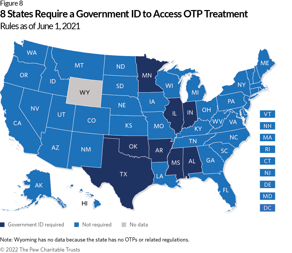Conversely, California allows OTPs to provide patient identification cards that include the individual’s photo, a unique identifier, and a physical description.14 This allows the OTP to verify the patient’s identity before dispensing methadone without requiring a government ID.