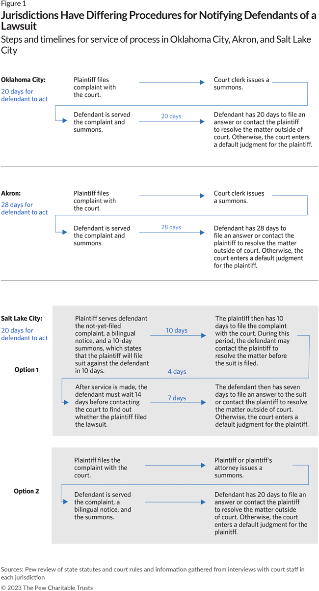 Another source of confusion can be jurisdictions’ own procedures for case filing, notification, and response. (See Figure 1.) In Oklahoma and Ohio, a plaintiff must first file a complaint with the court, after which the court clerk issues a summons, and the defendant is supposed to receive both. In Oklahoma, a defendant has 20 days after being served to file an answer or a default judgment will be entered against them.14 In Ohio, that deadline is 28 days.15 And in Utah, the plaintiff can choose to notify the defendant either before or after filing the complaint with the court. For service before filing, the plaintiff serves the defendant with a 10-day summons—a bilingual notice of the lawsuit—and a copy of the complaint that the plaintiff plans to file, which must then be done within 10 days.16 And for service after filing, the plaintiff sends the defendant the already-filed complaint, a summons, and a bilingual notice. In either case, the defendant technically has 20 days from the date service is made to file a response. However, if the plaintiff chooses the 10-day summons option, the defendant must allow at least 14 days after receiving that summons for the plaintiff to file and the court to process the complaint, cutting the defendant’s time to respond to just seven days. (If no complaint has been filed after 14 days, the defendant does not have to do anything.)17