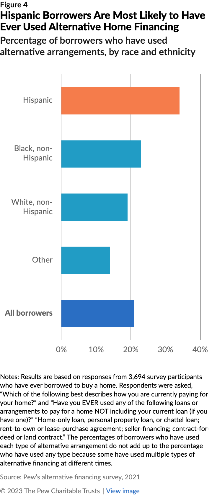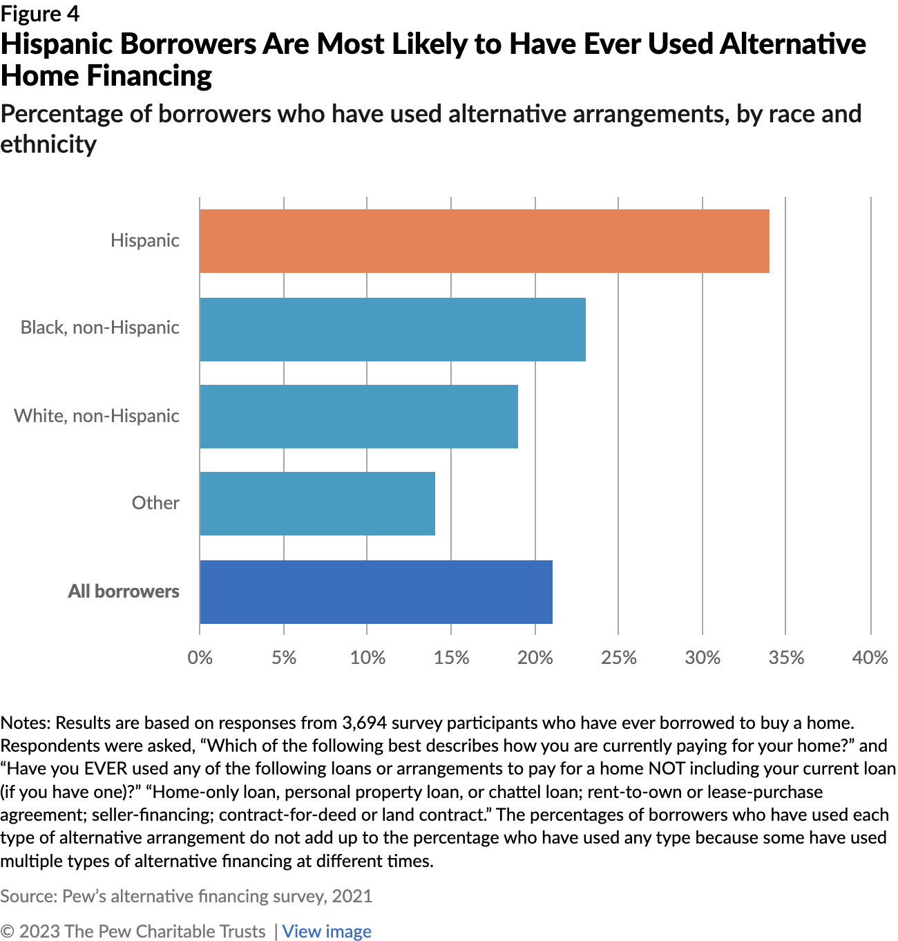 Further, the 2022 survey found that about half of alternative financing borrowers applied—and most reported being approved or preapproved—for a mortgage before entering into an alternative arrangement. Pew’s surveys of borrowers, interviews with legal aid experts, and review of research on alternative financing shed some light on the advantages of alternative financing—despite its added costs and risks—compared with mortgages for some homebuyers:
