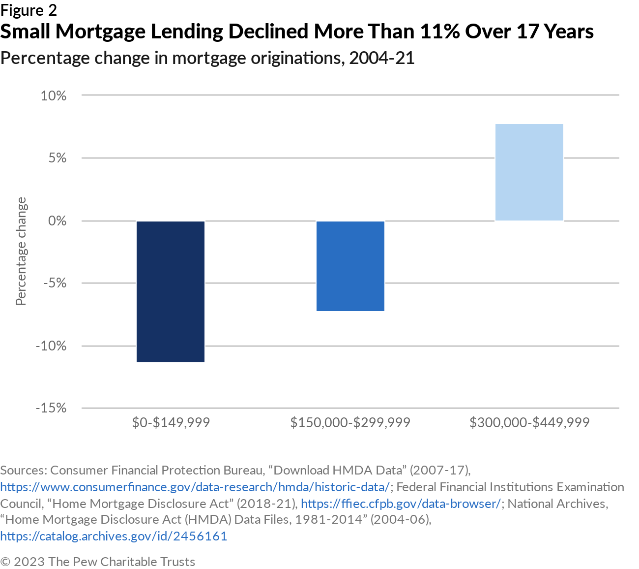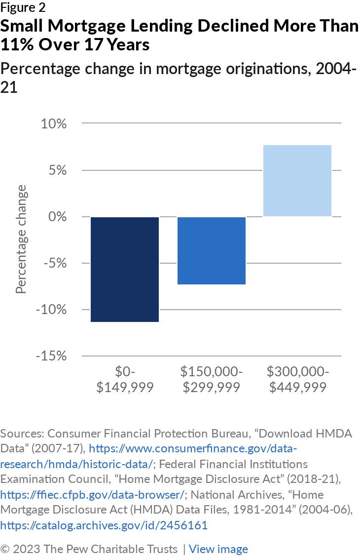 Small mortgages are less common today than they were before the Great Recession, when lenders issued small and large mortgages in roughly equal measure. In 2004, for example, lenders originated 2.7 million mortgages for less than $150,000 (in 2004 dollars) and 2.9 million large mortgages—those of $150,000 or more. But Pew estimates that from 2004 to 2021, small mortgage lending fell by nearly 70% to 830,000 loans a year, while large mortgage lending grew by 52% to 4.4 million loans annually. The decline was more acute in certain parts of the country. For instance, the Federal Reserve Bank of Philadelphia found that small mortgages declined by only 28% in Pennsylvania and Delaware from 2019 to 2021 but fell by 43% in New Jersey over the same span.13