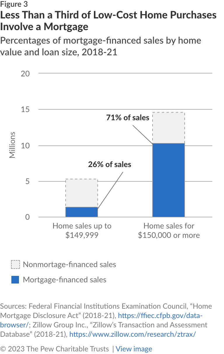 - Most low-cost home purchases do not involve a mortgage. Despite rising prices, sales of low-cost homes remain common nationwide, accounting for more than a quarter of total sales from 2018 to 2021. However, just 26% of properties that sold for less than $150,000 were financed using a mortgage, compared with 71% of higher-cost homes.