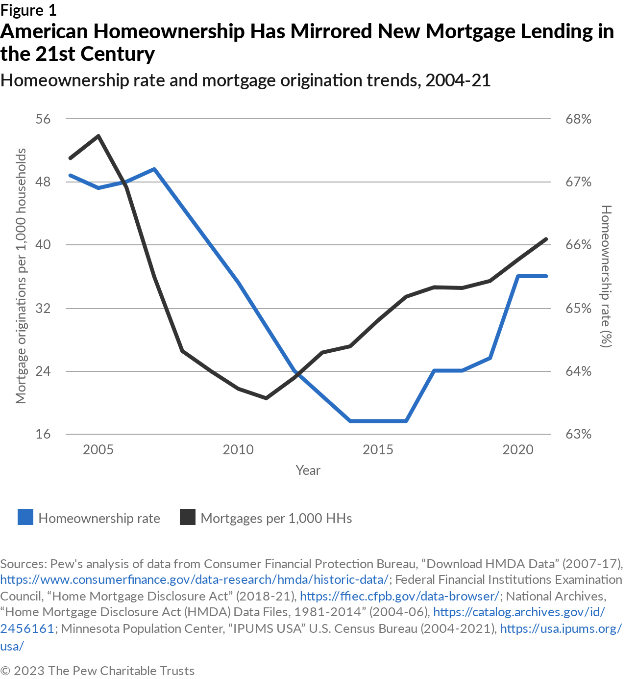 But regardless of their reasons for buying homes, most American families rely on mortgages to gain access to homeownership because they cannot afford to purchase a home with cash. According to a survey conducted from July 2021 to June 2022, 78% of homebuyers financed their purchases with mortgages, most of which were fixed-rate loans. Mortgages are even more prevalent among first-time homebuyers: 97% used a mortgage to purchase their starter home.9 Given the predominance of mortgages, it is no surprise that changes in mortgage availability have closely correlated with shifts in the nation’s homeownership rate over the past two decades.10 (See Figure 1.)