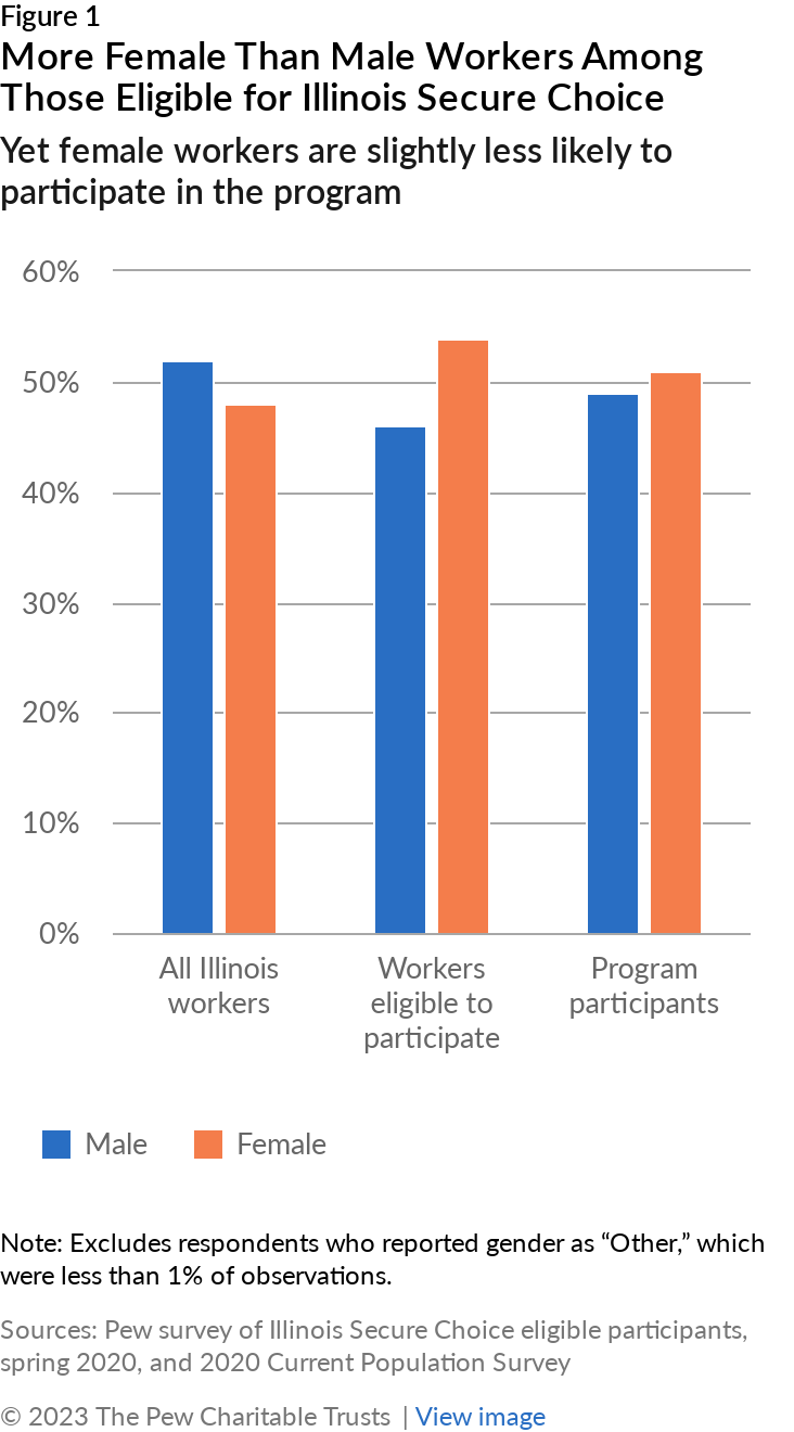 - More female than male workers are eligible to participate in Illinois Secure Choice, perhaps because women are more likely than men to work in part-time jobs—and many employer-sponsored plans are not available to part-time workers. Despite this greater access to Illinois Secure Choice, women are slightly less likely to participate in the program than men, potentially because of underlying differences in income.