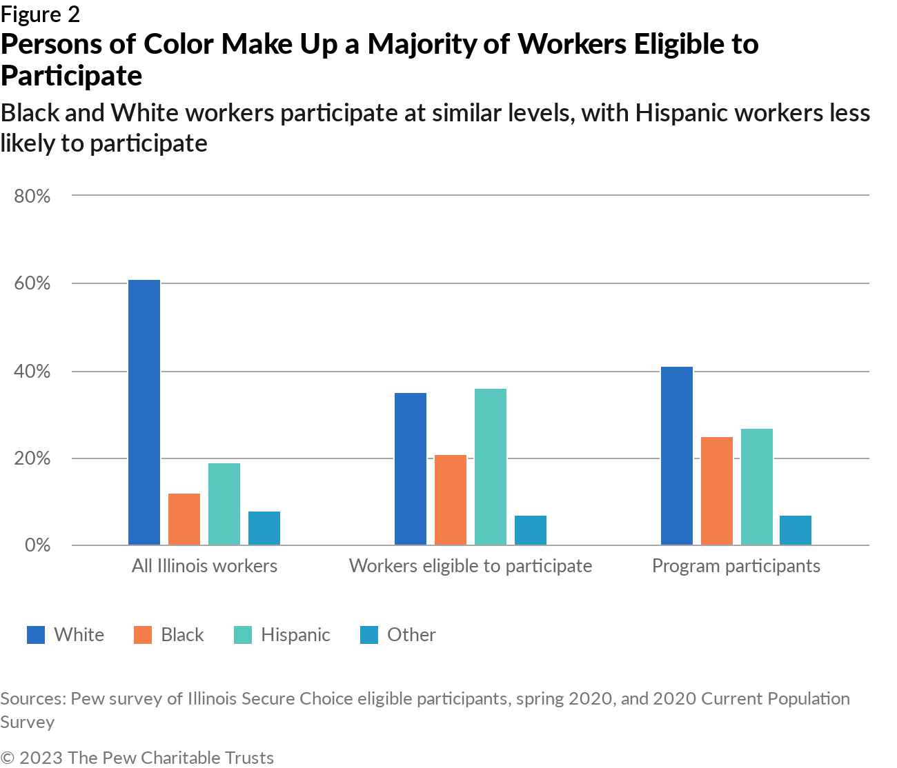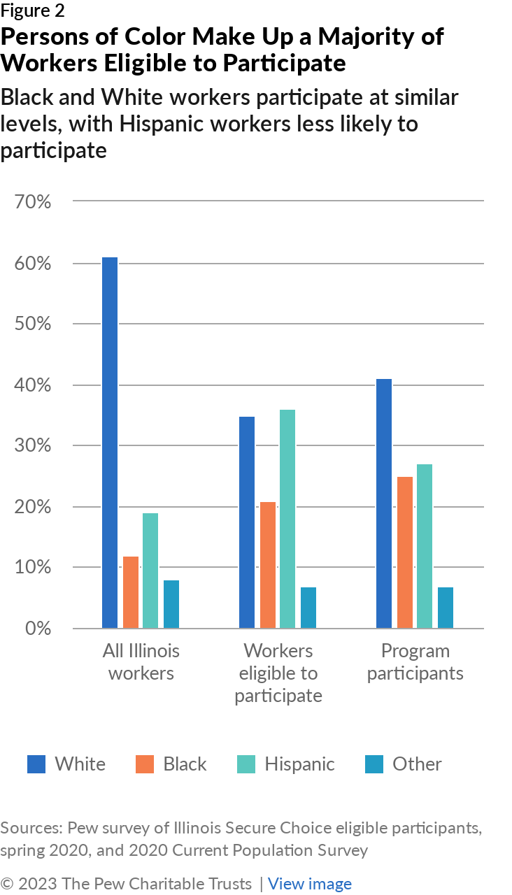 - A majority of people eligible for Illinois Secure Choice are workers of color. While Hispanic workers are less likely to participate in the program than are other workers eligible for the program—a trend that mirrors Hispanic participation rates in employer-sponsored plans—Black workers (as well as White workers) are more likely to participate than other eligible workers.