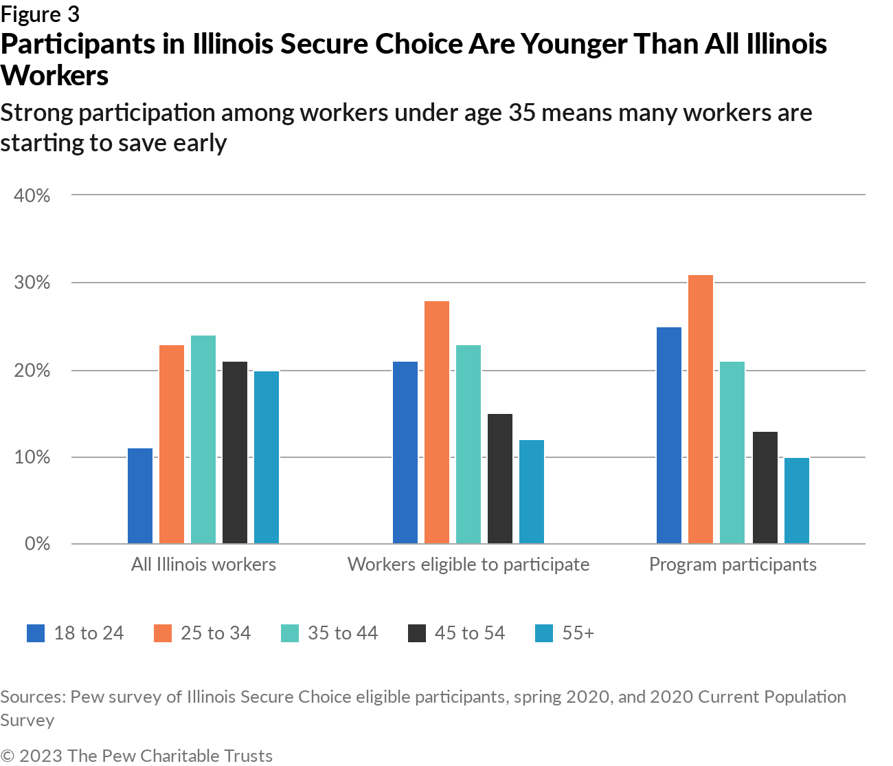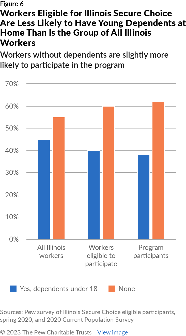 For the comparison to Illinois workers, Pew analyzed 2020 data from the Current Population Survey, sponsored by the U.S. Census Bureau and the U.S. Bureau of Labor Statistics. The data was limited to adult private sector wage and salary workers at employers that had at least 25 workers. Although Illinois Secure Choice started covering employers with five or more employees at the start of 2022, only employers of at least 25 employees were covered by the program at the time that eligible participants were surveyed.