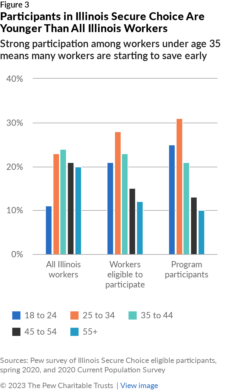 - Workers eligible for Illinois Secure Choice are comparably younger and have lower levels of educational attainment than the pool of all Illinois workers. Workers under age 35 also make up a larger share of Illinois Secure Choice participants than their share of those eligible for the program, while workers at each level of education are participating at rates similar to those at other levels of education. Both trends are a marked difference from participation in employer-sponsored plans, in which older workers and those with higher levels of educational attainment are more likely to participate than younger workers and those with lower levels of educational attainment.