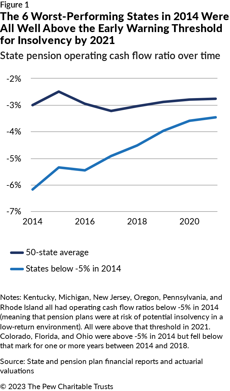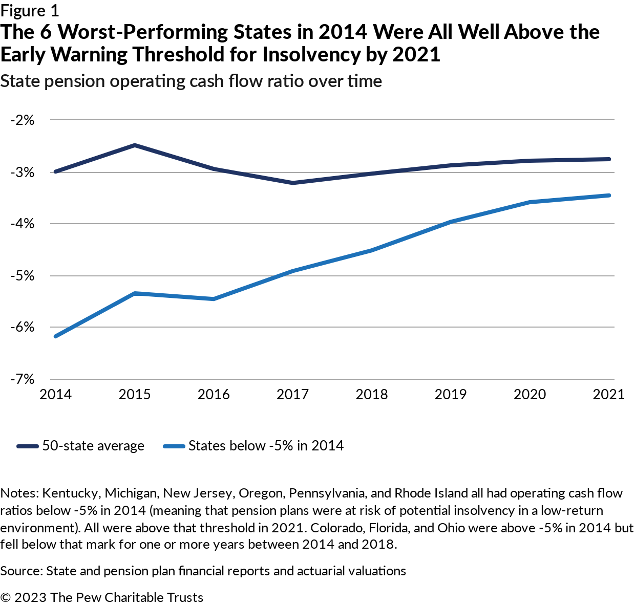 Pew has identified an OCF ratio below -5% as an early warning sign of potential insolvency, based on the assumption that there is a reasonable likelihood of a plan experiencing a period of lower-than-expected investment performance over a 20-year period in which average returns fall below 5%. In 2014, six states fell below that -5% threshold. By 2021, every one of the 50 states had a cash flow ratio above −5%. This improvement was thanks largely to a significant increase in employer contributions from 2014 to 2021, with an average 6.7% annual growth over this seven-year period. Likewise, benefit reforms, including limits to cost-of-living adjustments in many states, have helped reduce growth in benefit payments, further improving cash flow.