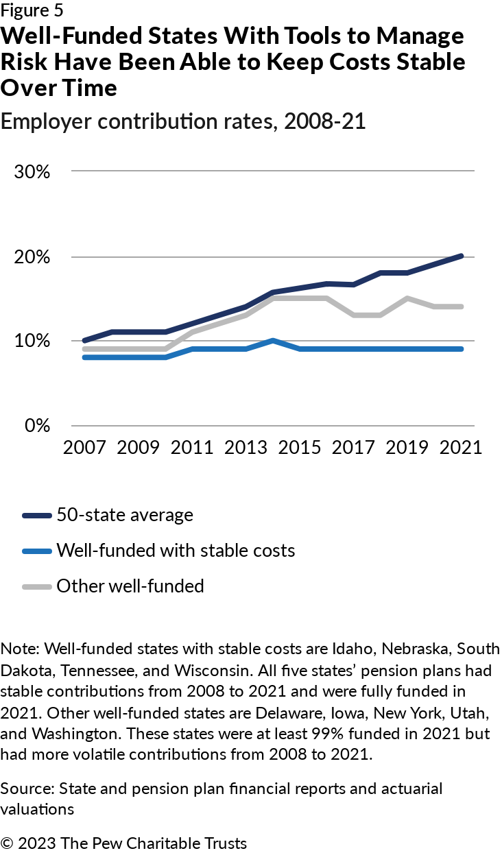 If future investment losses or economic uncertainty force states to increase pension contributions dramatically again because they haven’t put in place tools to manage risks, plan sponsors may be unwilling or unable to fund pension promises. That’s why predictability of costs is part of Pew’s test of fiscally sustainable pension policies. As models, states such as South Dakota, Tennessee, and Wisconsin have demonstrated that fiscal discipline and sound policy can help states keep pension promises by maintaining full funding and stable costs.8 All three of those states have maintained high funding levels while keeping employer contributions stable (fluctuating by no more than 3% of payroll from 2007 to 2021). As a result, the cost of pensions to state and local budgets has been relatively consistent regardless of whether you were looking at 2007, 2012, or 2020.