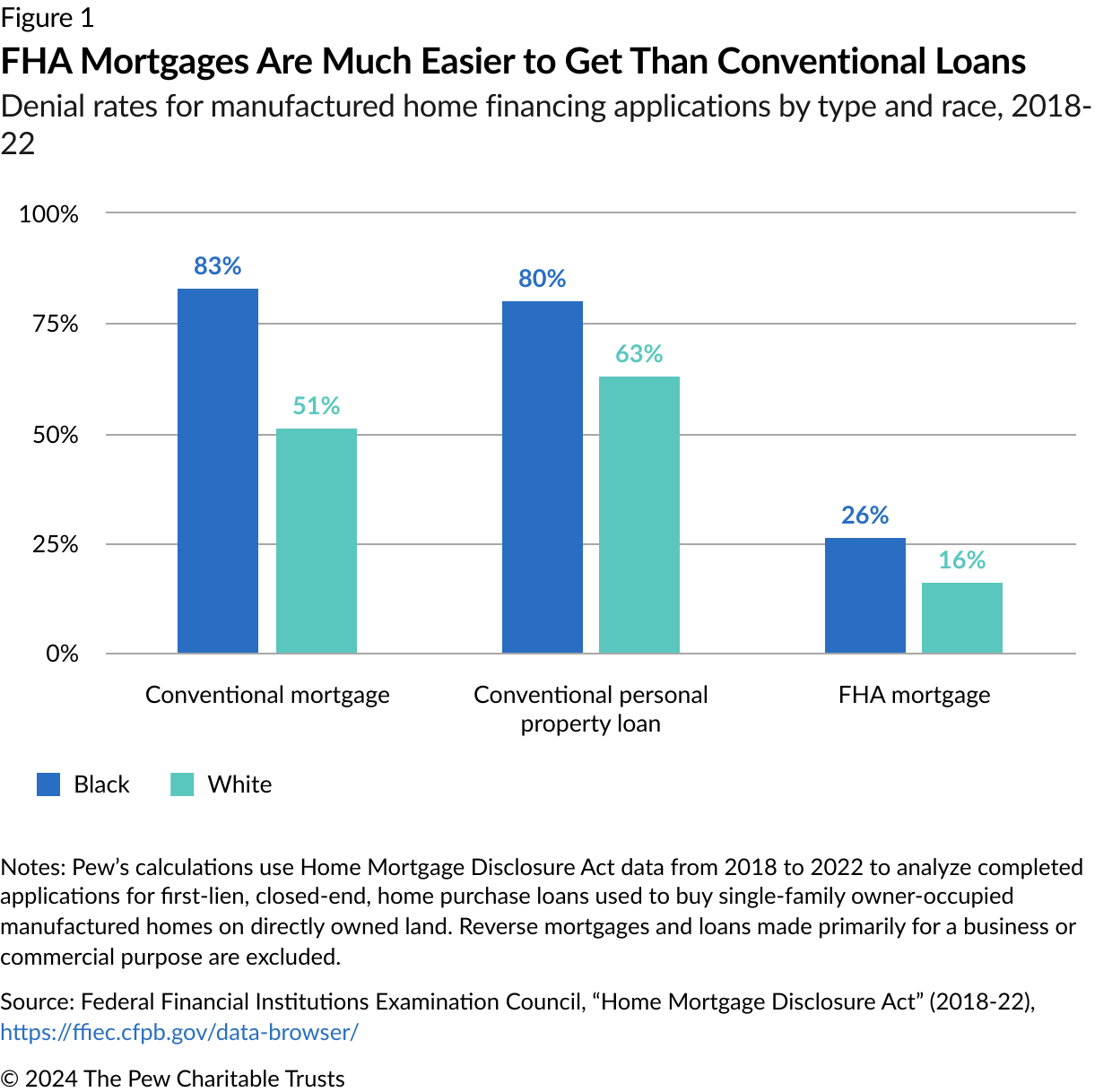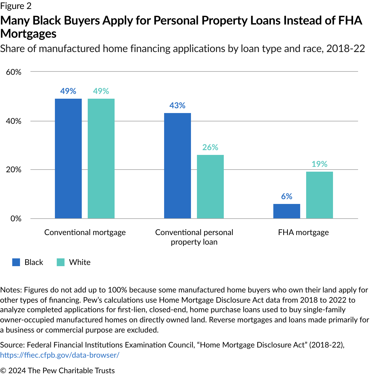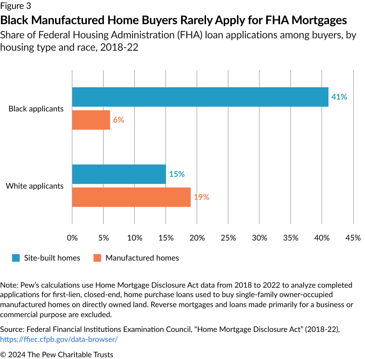 - Data on manufactured home loans comes from the Home Mortgage Disclosure Act. Pew analyzed completed applications for first-lien, closed-end, home purchase loans used to buy single-family owner-occupied manufactured homes on directly owned land. Reverse mortgages and loans made primarily for a business or commercial purpose are excluded from the analysis.