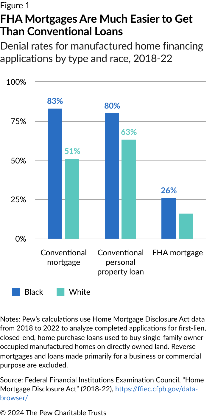 Taken together, expanding the FHA’s mortgage program and updating Title I would help remedy the disparities Black applicants face when seeking manufactured home financing. The Pew Charitable Trusts estimates that such changes would allow the FHA to double Black applicants' access to manufactured home financing while adding only minimally to the risks borne by the agency.