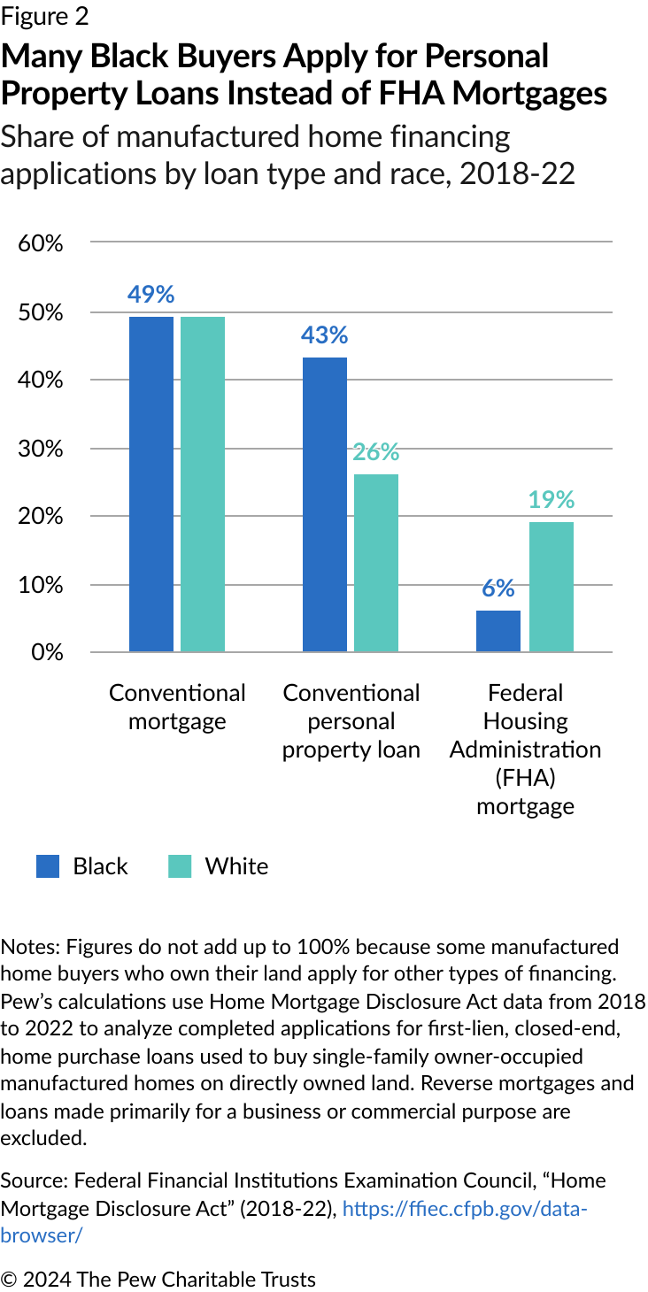 Yet despite the higher chance of being denied for a conventional loan than for an FHA loan, Black manufactured home buyers apply for conventional loans far more often than for FHA mortgages. From 2018 to 2022, 92% of Black borrowers applied for a conventional mortgage or personal property loan compared with just 6% who applied for an FHA mortgage (the other 2% applied for loans from the Department of Veterans Affairs or from the U.S. Department of Agriculture). In contrast, 75% of White applicants for manufactured homes sought a conventional loan and 19% applied for an FHA mortgage. (See Figure 2.) This difference is mostly accounted for by the relatively high share of Black applicants who sought personal property loans.