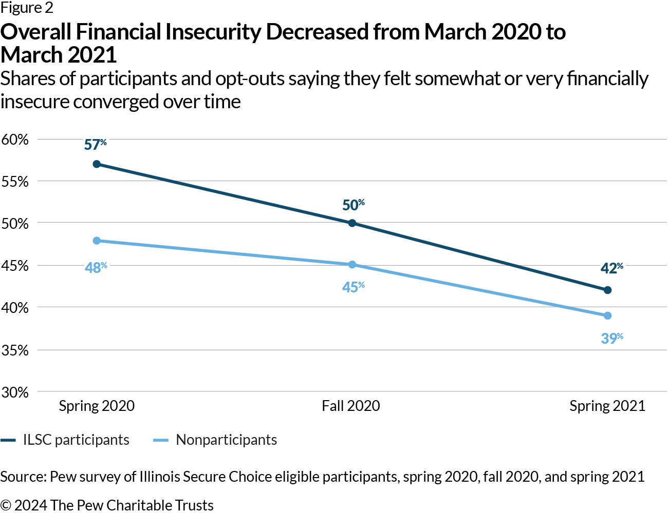 - J. Scott and M. Hines, “Many in Illinois Retirement Savings Program Feel Their Financial Security Is Improving,” The Pew Charitable Trusts, April 18, 2022, https://www.pewtrusts.org/en/research-and-analysis/articles/2022/04/18/many-in-illinois-retirement-savings-program-feel-their-financial-security-is-improving.