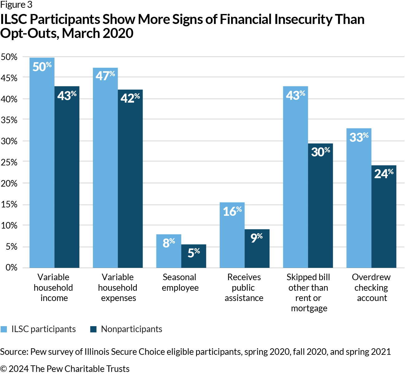 To help The Pew Charitable Trusts learn more about workers’ experiences with ILSC, the Rand Corporation surveyed 1,100 adults eligible to participate in the program—workers enrolled in the program as well as those who opted out. The longitudinal study was conducted in three waves at roughly six-month intervals, with the first wave fielded in the spring of 2020, the second wave in the fall of 2020, and the third wave in the spring of 2021.3 This brief looks at Illinois workers’ perceptions of financial security in early survey waves and whether these perceptions changed across waves. It also examines whether financial security was linked to income and expense patterns, race and ethnicity, marital status, and other personal and household factors. Among the key findings: