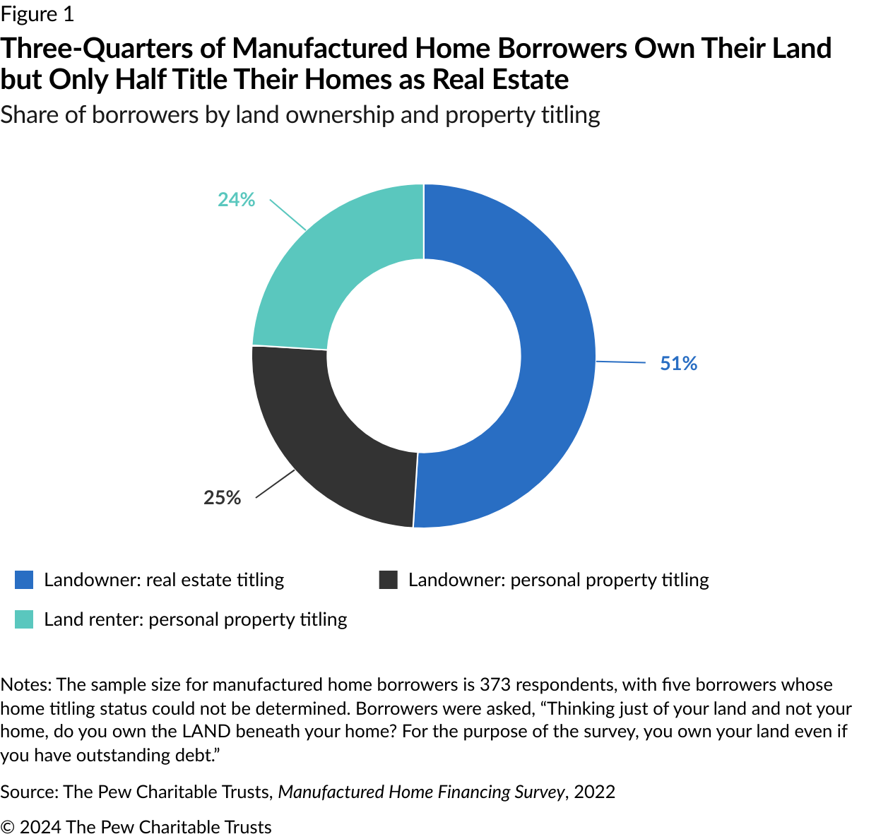 In Pew’s survey, 76% of current manufactured home borrowers said they own their home and land (usually on private land). These borrowers, therefore, could be eligible for mortgages if their property was titled as real estate, but 25% of them still title their manufactured home as personal property rather than real estate. The remaining 24% own their homes but not land, and almost always must title their manufactured home as personal property. In total, then, only about half of all manufactured home borrowers title their homes as real estate. (See Figure 1.)
