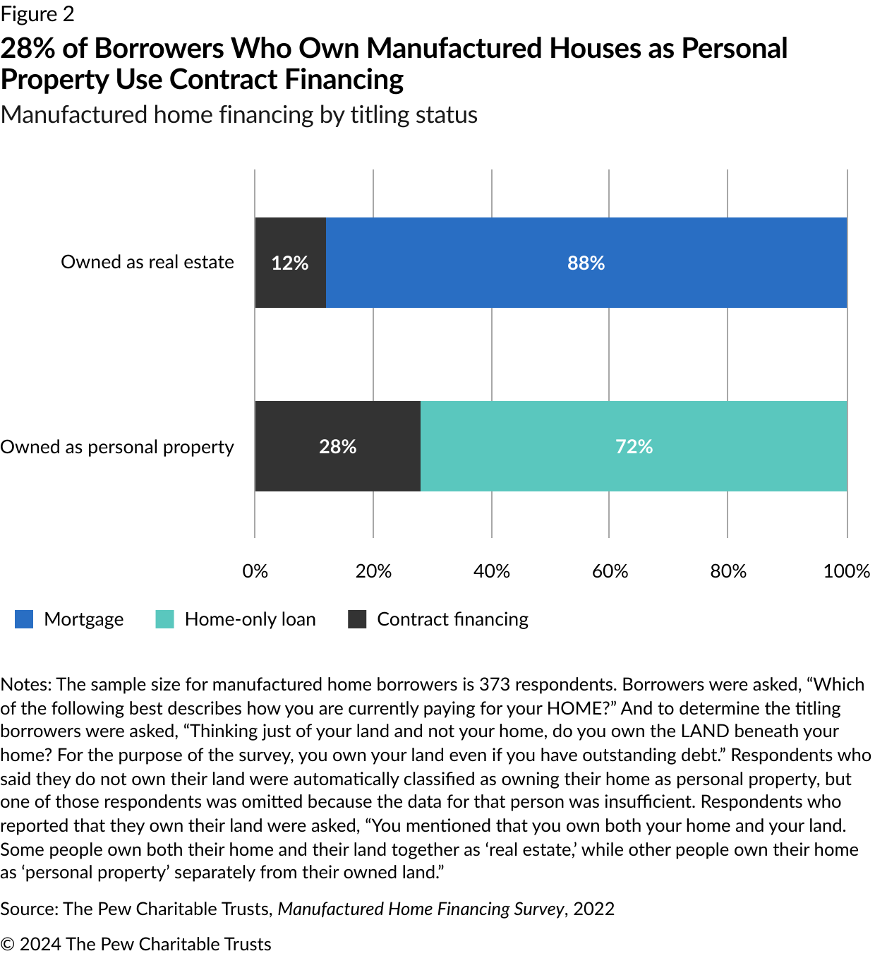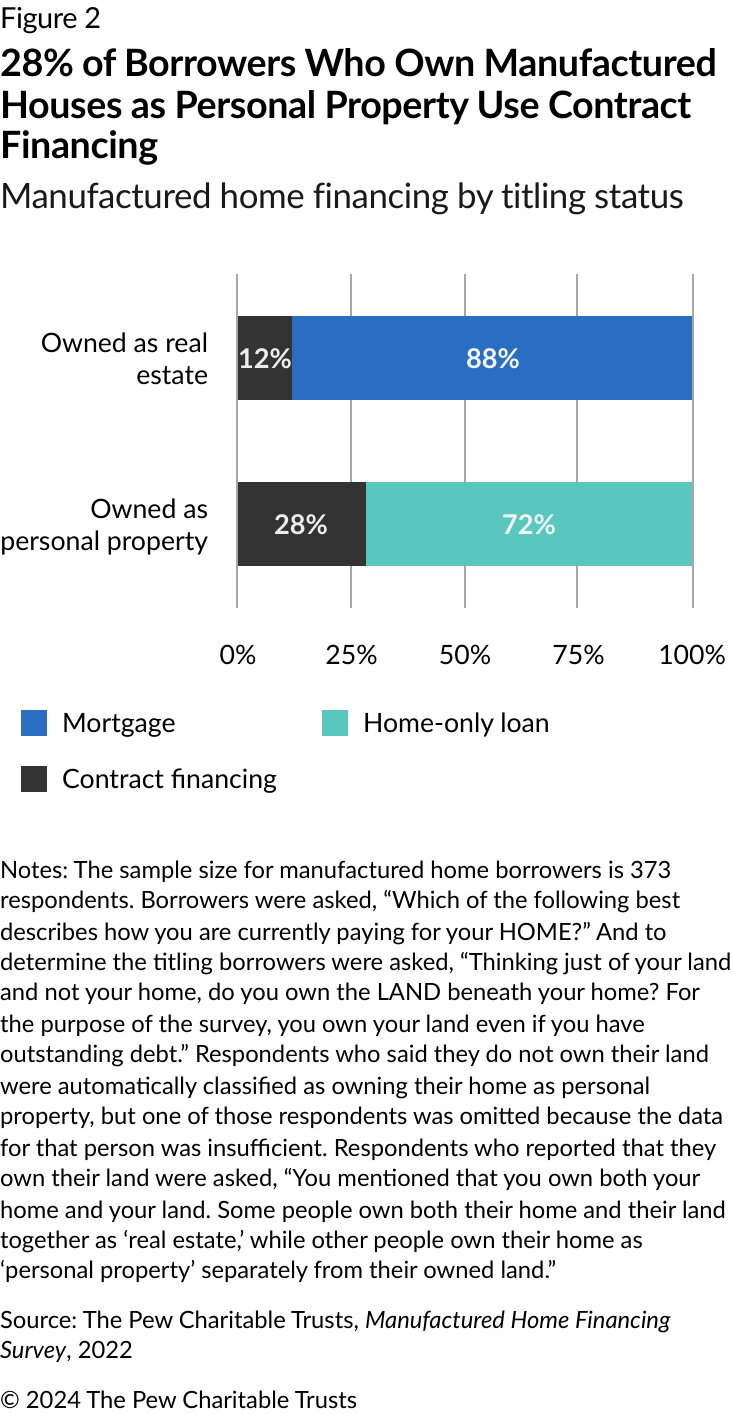 Manufactured home borrowers use financing in vastly different ways compared with borrowers who buy site-built homes. Pew’s survey shows that this is largely driven by how a property is titled—whether as personal property or real estate.