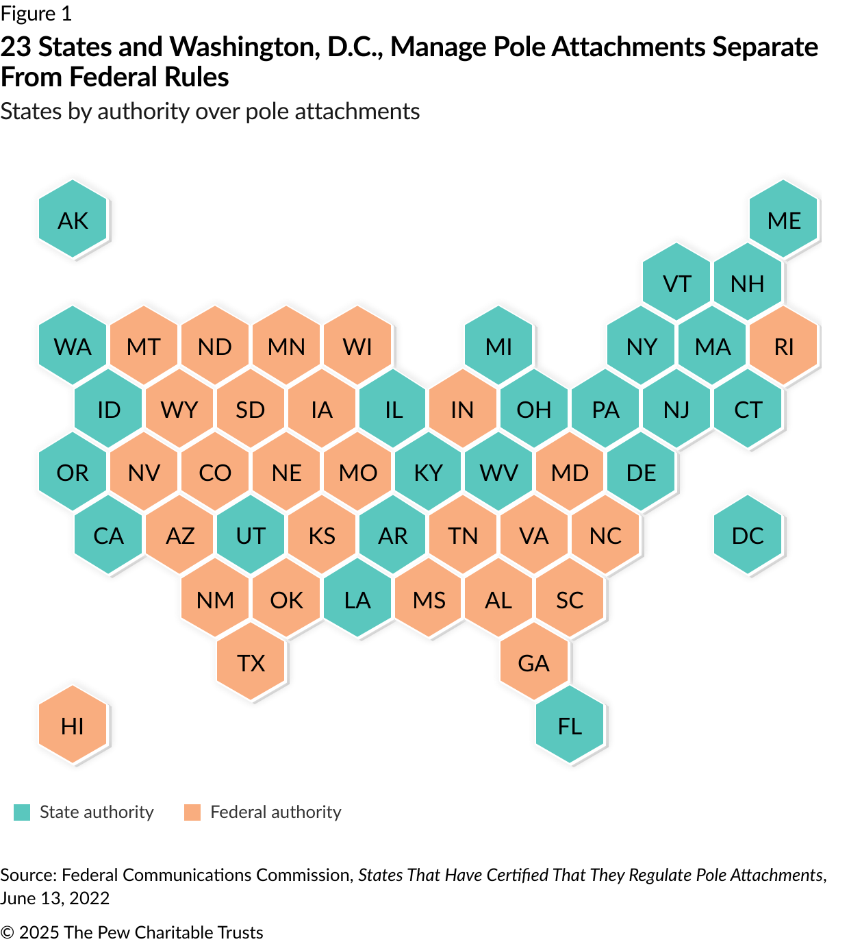 - Federal Communications Commission, “States That Have Certified That They Regulate Pole Attachments,” news release, June 13, 2022, https://docs.fcc.gov/public/attachments/DA-22-630A1_Rcd.pdf.