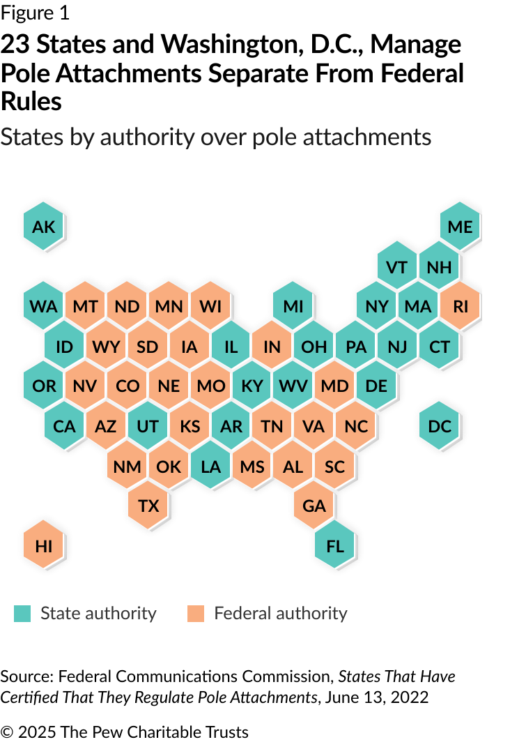 Pew’s interviews identified a set of state-level policy interventions to improve the pole attachment process, with a particular emphasis on the states that regulate poles independently. (The Federal Communications Commission [FCC] adopted new rules in 2023 for pole attachments in states under federal jurisdiction.4)