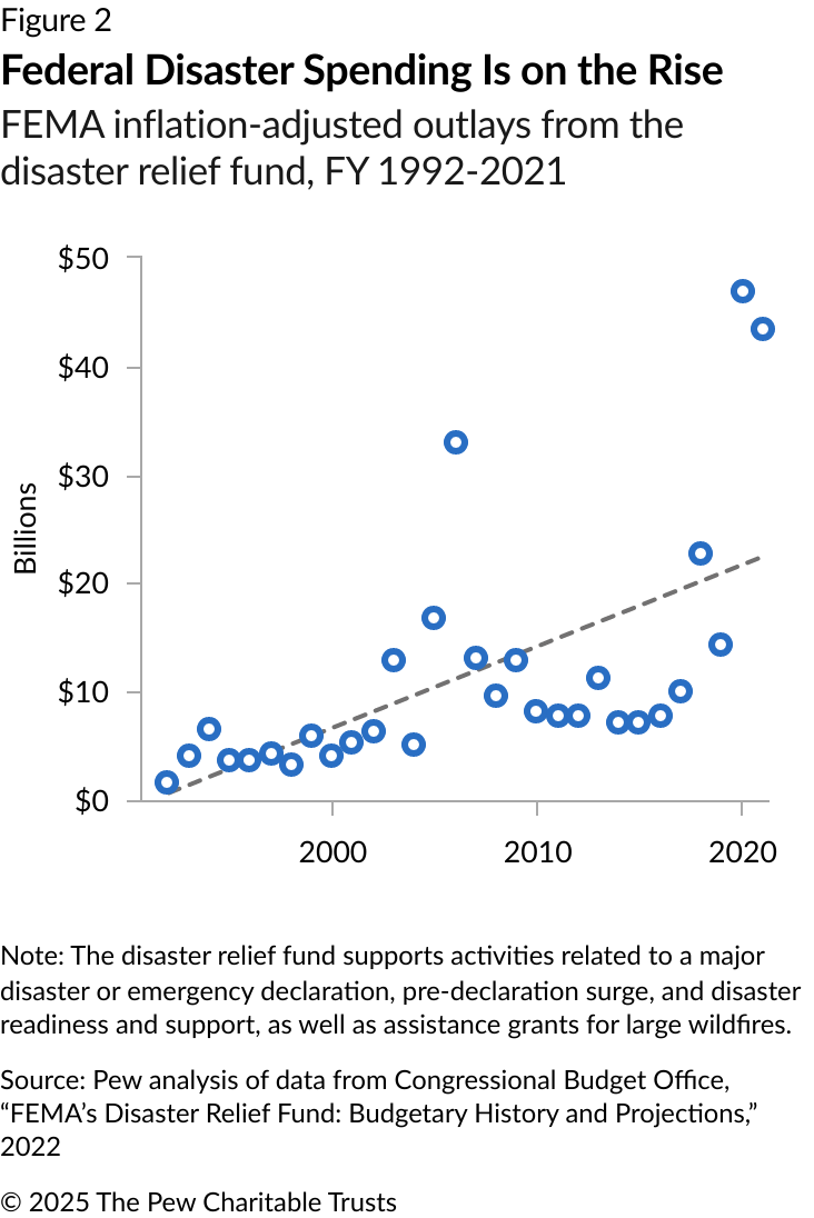 A series of studies from The Pew Charitable Trusts from 2018 to 2022 examined how states manage the fiscal impact of natural disasters, including their spending practices, funding mechanisms, and risk reduction (mitigation) investments. The research revealed that data on public disaster spending is lacking, that states’ typical budgeting approaches have not adapted to recent disaster trends, and that efforts to reduce loss of life and property, which could help control rising costs in the long term, are inconsistently and insufficiently funded.