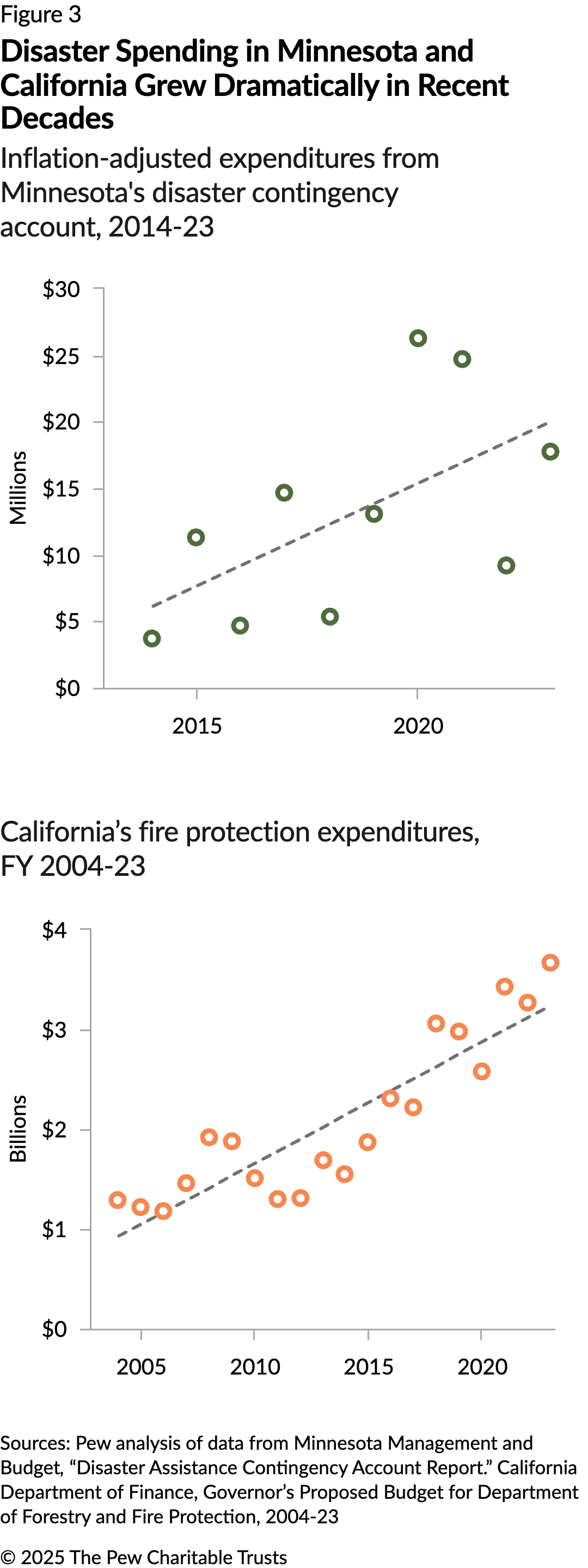 Although, as Pew’s 2018 research found, state disaster spending data is limited, the available evidence shows a pattern of expenditures similar to that of the federal level.5 (See Figure 3.) Minnesota, for example, spent $18.3 million from its disaster contingency account in 2023, nearly five times what it spent in 2014, after accounting for inflation. The disaster contingency account provides funding to state agencies, local and Tribal governments, and certain private entities for disaster response and recovery. And in California, inflation-adjusted spending on wildfire suppression has tripled over the past two decades.
