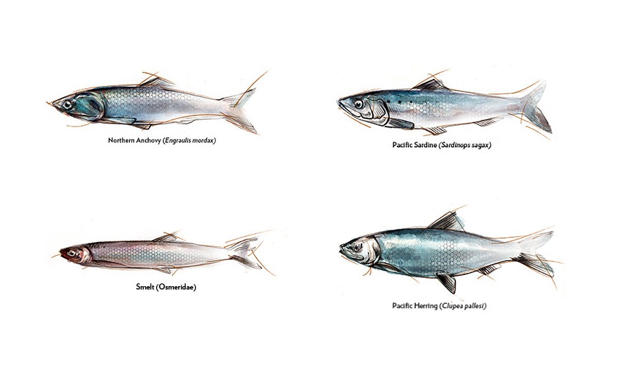 Figure: Common forage fish species in the California Current (illustrations are not to scale)