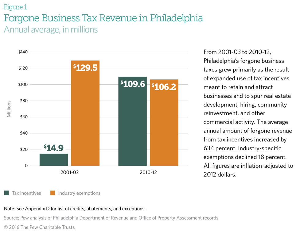 In 2012, the staff of the Pennsylvania Intergovernmental Cooperation Authority (PICA), a state agency that oversees Philadelphia’s finances, called on the city to clarify and evaluate specific tax expenditures, concluding: “A lack of detailed accounting prevents a systematic process of evaluating whether the costs of these policies are justified in relation to their benefits.”