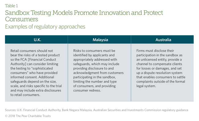 In 2015, international regulators began employing regulatory “sandboxes”—formal testing programs that feature relaxed regulations and special enhanced consumer protections—which allow companies and regulators to test and observe new products and services in the marketplace. Several governments, including Australia, Hong Kong, Indonesia, Malaysia, Singapore, Thailand, Abu Dhabi, and the U.K., have embraced the sandbox approach, beginning with the U.K. in 2015. Although these efforts are mostly in their nascent stages and the empirical evidence on their effectiveness is scant, they do offer a window into regulators’ attempts to balance promotion of innovation with consumer safety.
