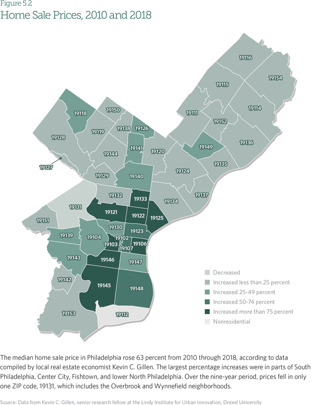Home sale prices have risen 63 percent since 2010, creating wealth in some parts of the city but not in others. Center City has seen the most substantial increases. In much of the Northeast, Northwest, and Southwest, however, the gains have been far more modest.