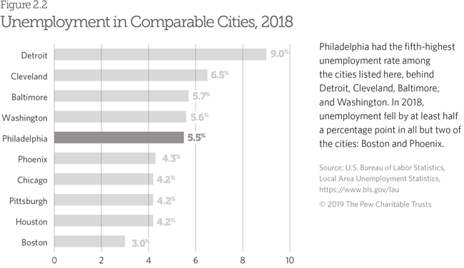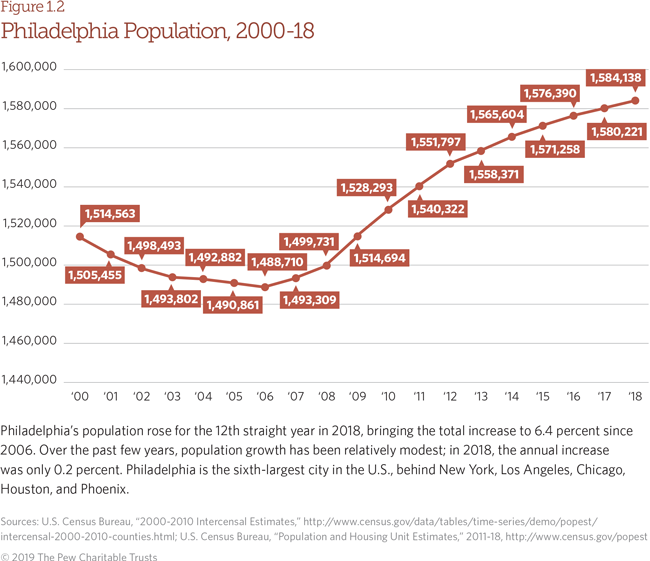 Editor's note: On Aug. 26, 2020, Figure 2.13, in the PDF, was updated to clarify the types of businesses and the geographic region covered by the U.S. Census Bureau data presented in the graphic. Figures 1.2 and 2.2 were previously updated May 1, 2019, to reflect newly released and updated population and employment numbers from the U.S. Census Bureau and the U.S. Bureau of Labor Statistics. In September 2019, the U.S. Census Bureau identified an error in its 2017 data for Philadelphia. The following topics were affected: employment status, health insurance, households and families, income and earnings, rent (no rent paid), and poverty. The Census Bureau does not plan to update the 2017 data, and Pew will not use the 2017 data in these topic areas in subsequent analyses.