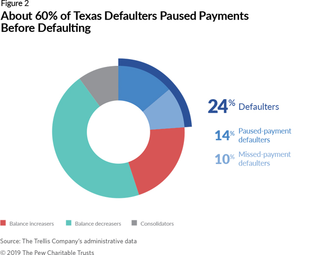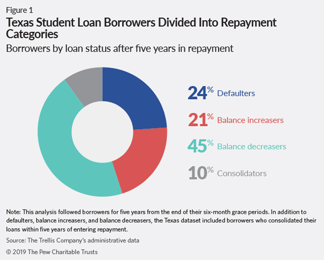 To help fill this information gap and better understand where public policy can have the greatest impact, The Pew Charitable Trusts commissioned the Trellis Company, a Texas-based organization that acts as a guarantor for the Federal Family Education Loan (FFEL) program, to conduct an analysis of almost 400,000 borrowers in that state (referred to as “Texas borrowers” throughout the paper) during the five-year period beginning when their loans entered repayment anytime between October 2007 and September 2011. Based on the repayment activity and outcomes over those five years, the researchers divided borrowers into three main groups: those who had defaulted, those who owed more than their original balances, and those who owed less than their original balances. (See Figure 1.)