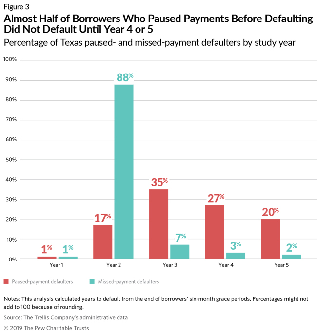 Of these paused-payment defaulters, almost half defaulted in year four or five of the study, indicating that they probably made a least a few payments. (See Figure 3.) However, many cycled in and out of delinquency—42 percent had three or more—and showed potential signs of distress almost immediately. At the median, these borrowers experienced a delinquency in the second month of repayment.
