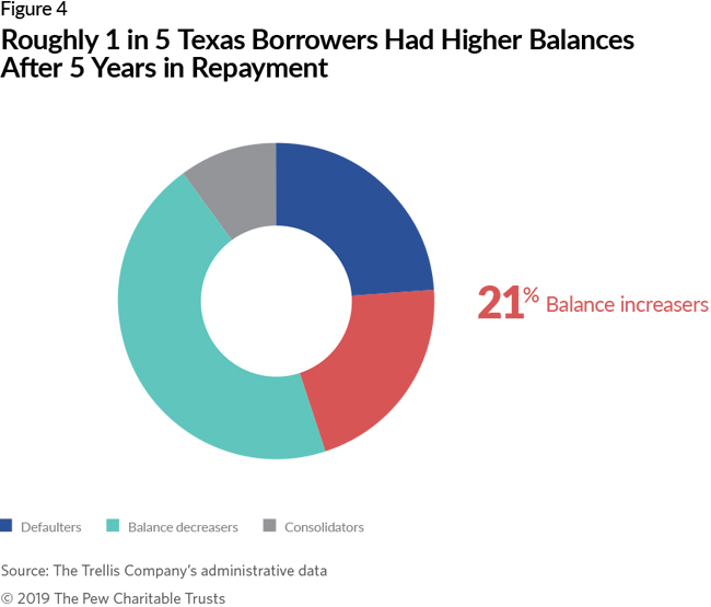 54. Although Texas balance increasers did not consolidate their loans during the study period, national borrowers who owed more after five years might have done so. If Texas consolidators had larger balances after five years than when they started repaying, the Texas figure underestimates the total percentage of balance increasers. This figure is probably lower at the national level because of differences in when borrowers were measured and the compositions of the datasets. (For more information, see Appendix B.)