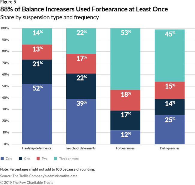 Sixty percent of defaulters had paused payments at least once, but among balance increasers, that number was 98 percent. Many had done so repeatedly, and most continued to have interest accrue while their payments were paused: 88 percent had at least one and 53 percent had three or more forbearances. (See Figure 5.)