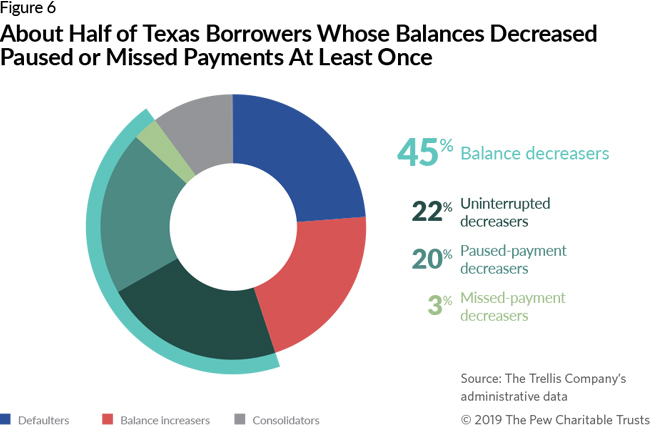 63. Only 19 of the 78,685 Texas paused-payment decreasers had not missed or paused payments except for an in-school deferment. Most also used hardship deferments or forbearances.