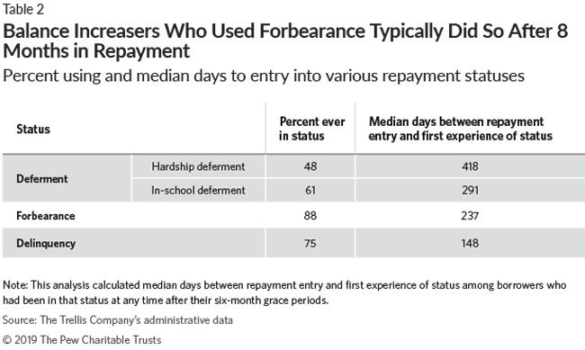 In addition, 48 percent of balance increasers—a larger percentage than paused-payment defaulters—used hardship deferments, and about a quarter used both hardship and in-school deferments. However, heavy usage of forbearance and deferments should not be understood as indicative of any particular financial circumstance. It may be so, but it could also show that this group was especially successful at accessing and utilizing the available tools for avoiding default.