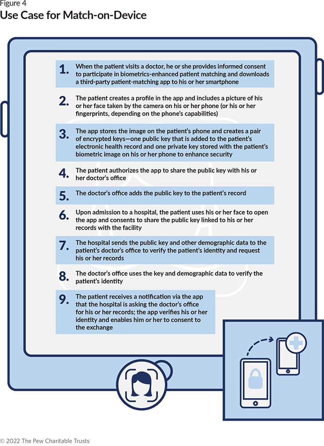 - Storing encrypted biometrics on patients’ personal devices (such as smartphones) is preferable to storing them in a single national repository or across various health systems’ databases. Called “match-on-device,” this approach reduces security and privacy risks but can introduce logistical and accessibility-related challenges, especially for patients without a smartphone or broadband internet connection.
