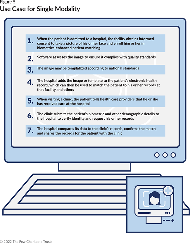 - Biometrics should be used alongside demographic data such as address, birthdate, and Social Security number to match patient records; they should not be the sole matching mechanism. (As a result, this report uses the term “biometrics-enhanced patient matching” to describe this hybrid approach.)