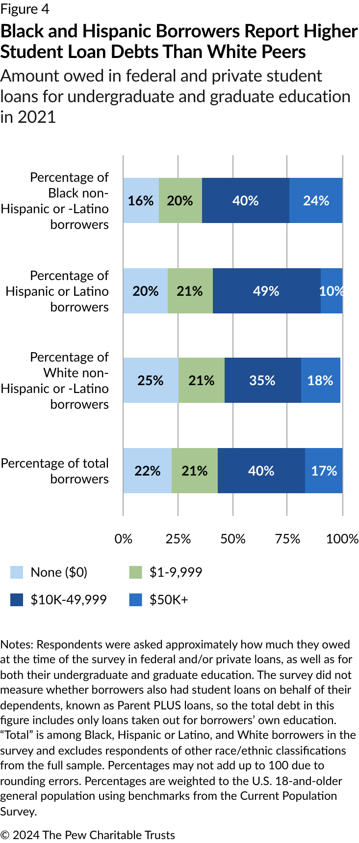 To better understand the underlying factors that influence these disparate outcomes, including how borrowers’ repayment patterns could be affected by economic and educational barriers such as racial discrimination, The Pew Charitable Trusts conducted a representative survey of student loan borrowers who first received undergraduate loans between 1998 and 2018, as well as a review of academic literature on the topic of student loan repayment and race.2 This report draws on those analyses and also builds upon Pew’s previous research on student loan repayment issues, which includes surveys and interviews with researchers, regulators, loan servicers, and borrowers.
