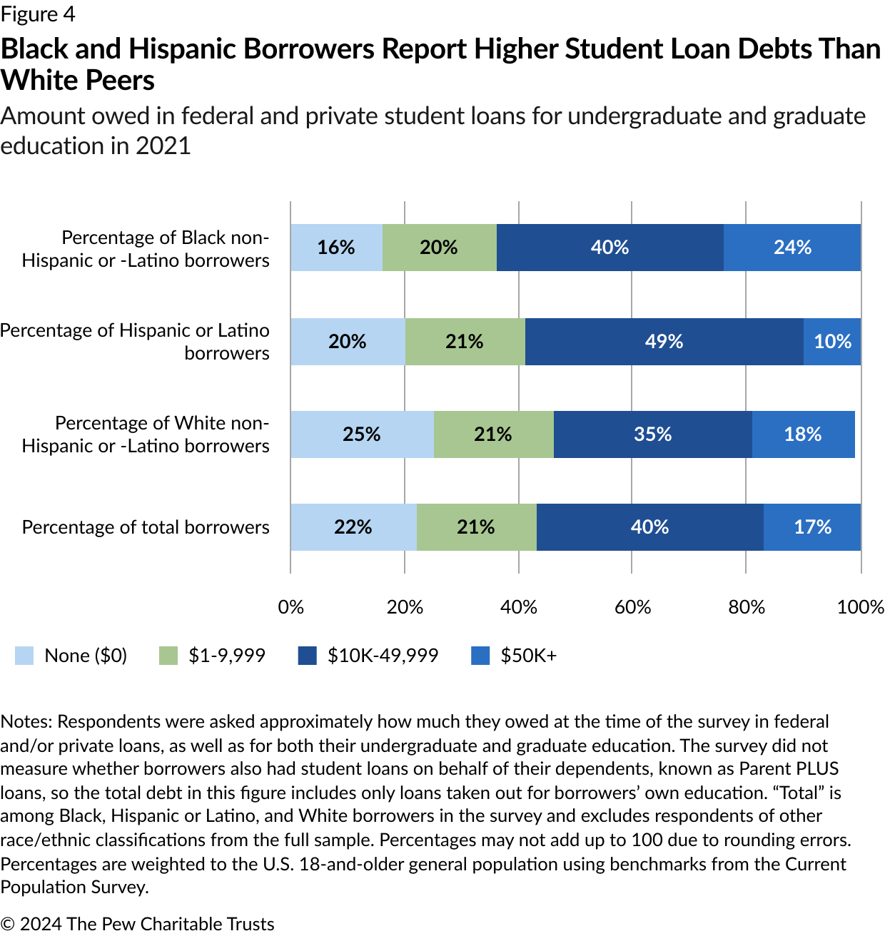 - The Pew Charitable Trusts, “Borrowers Discuss the Challenges of Student Loan Repayment,” 2020, https://www.pewtrusts.org/en/research-and-analysis/reports/2020/05/borrowers-discuss-the-challenges-of-student-loan-repayment.