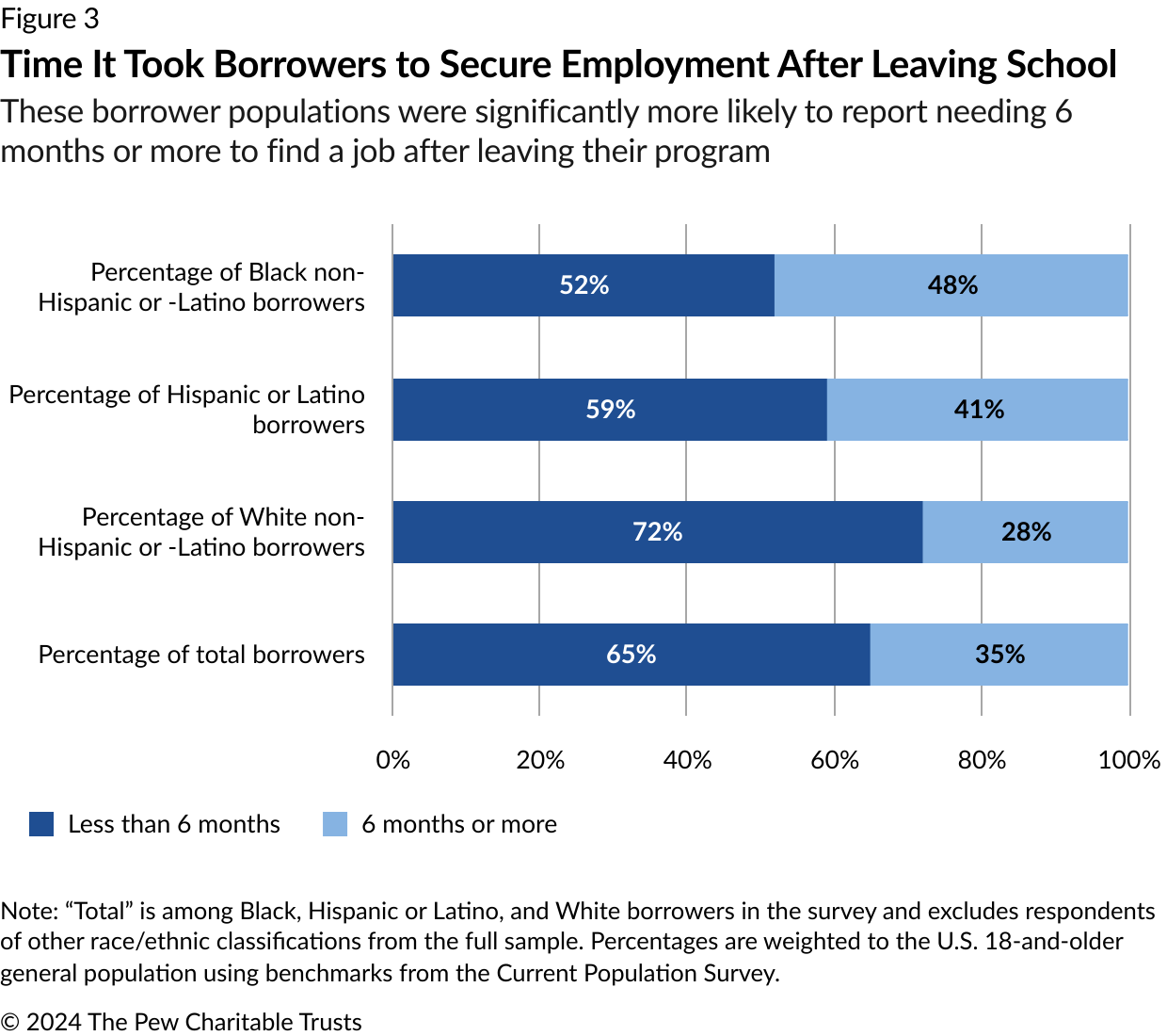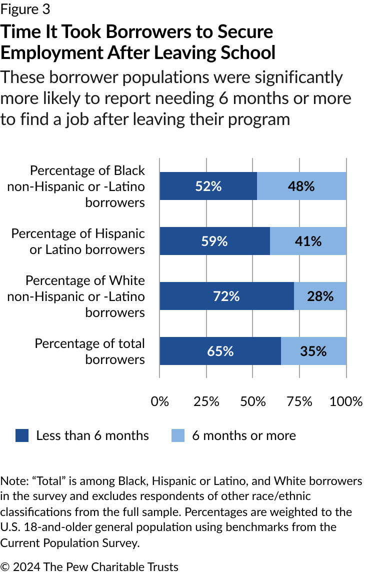 Workplace discrimination has been well documented in research to date.34 With respect to the hiring process, one meta-analysis of 24 studies conducted between 1989 and 2015 found that White job applicants typically received significantly more callbacks than their equally qualified Black or Hispanic or Latino counterparts.35 The study also concluded that this type of labor discrimination has not significantly declined over this time frame, particularly with respect to Black applicants. This is concerning given data addressed later in this report that finds that Black and Hispanic or Latino borrowers reported needing six or more months to secure a job upon leaving school at much higher rates than their White peers. Payments on federal student loans begin six months after leaving school.
