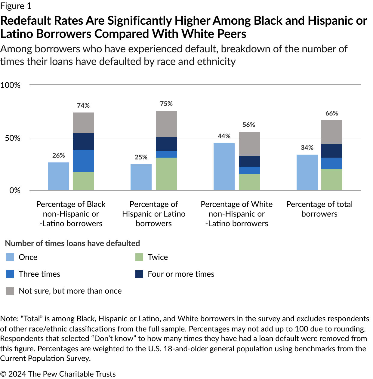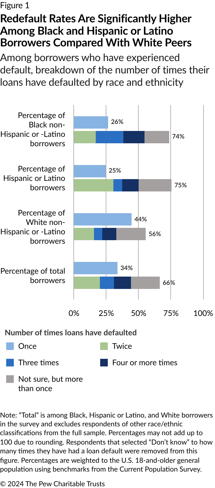 - During this period, three-quarters of Black and Hispanic or Latino borrowers who experienced default reported doing so multiple times (74% for Black, 75% for Hispanic or Latino) compared with 56% among White borrowers.