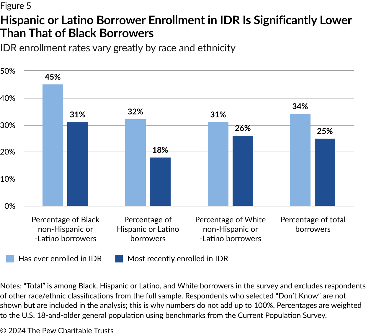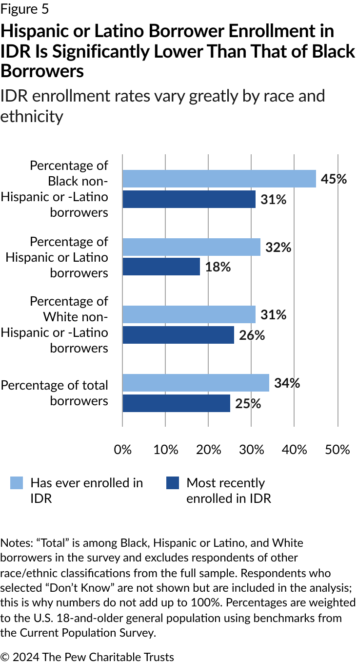 - Income-driven repayment (IDR) plans can provide sustained financial relief to struggling borrowers by setting the amount they must pay based on their income and family size. The less they earn, the lower their monthly payment. Yet the research found some evidence that Hispanic or Latino borrowers who would benefit from these plans are not enrolling: Hispanic or Latino borrowers’ enrollment rate (32%) into IDR plans is significantly below that of Black (45%) borrowers. (Enrollment by White borrowers is 31%.) What’s more, historically some borrowers, especially those who are Black, have reported challenges with IDR plans, such as completing the required paperwork for enrolling in and staying in these plans.