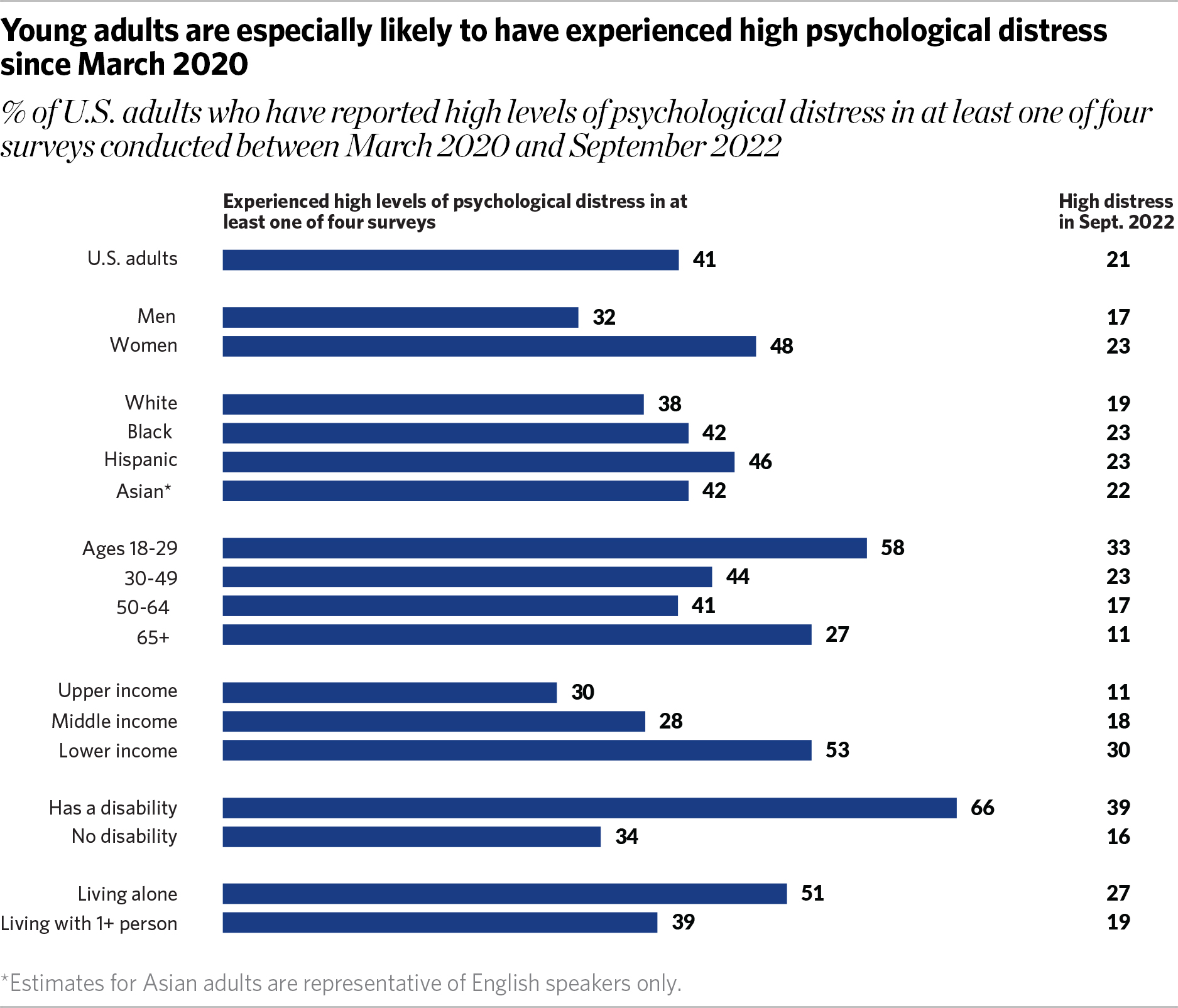 At Least Four in 10 U.S. Adults (41%) Have Experienced High Levels of Psychological Distress at Some Point During the Pandemic, According to Four Pew Research Center Surveys Conducted Between March 2020 and September 2022.