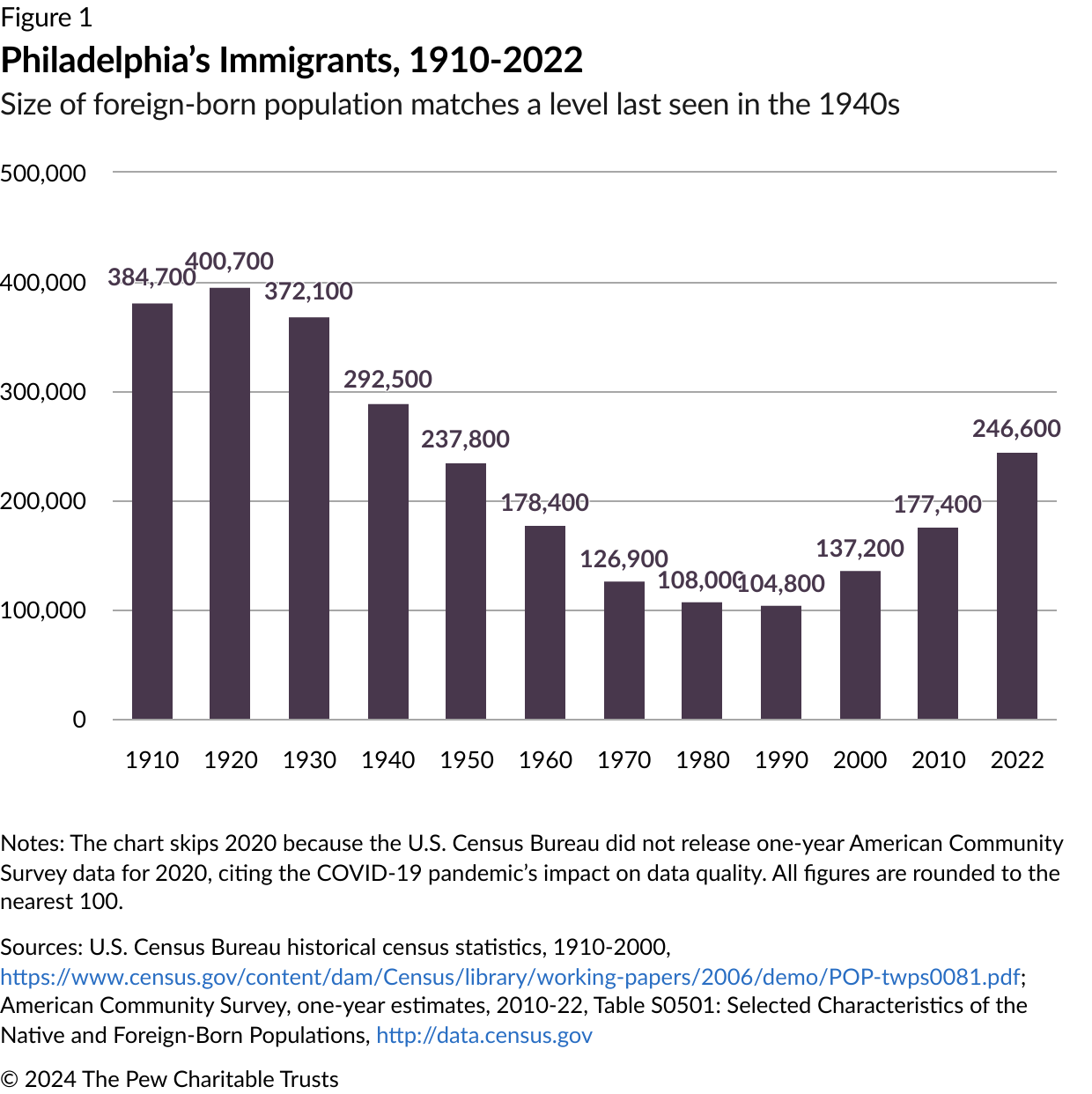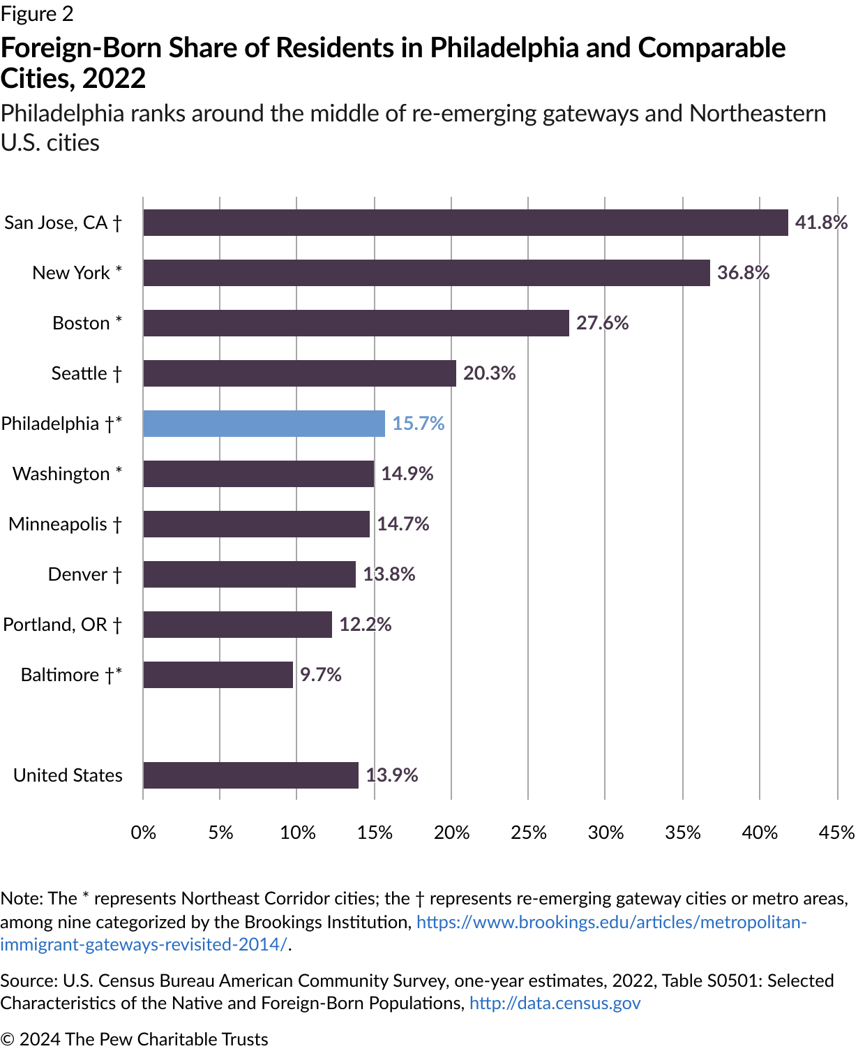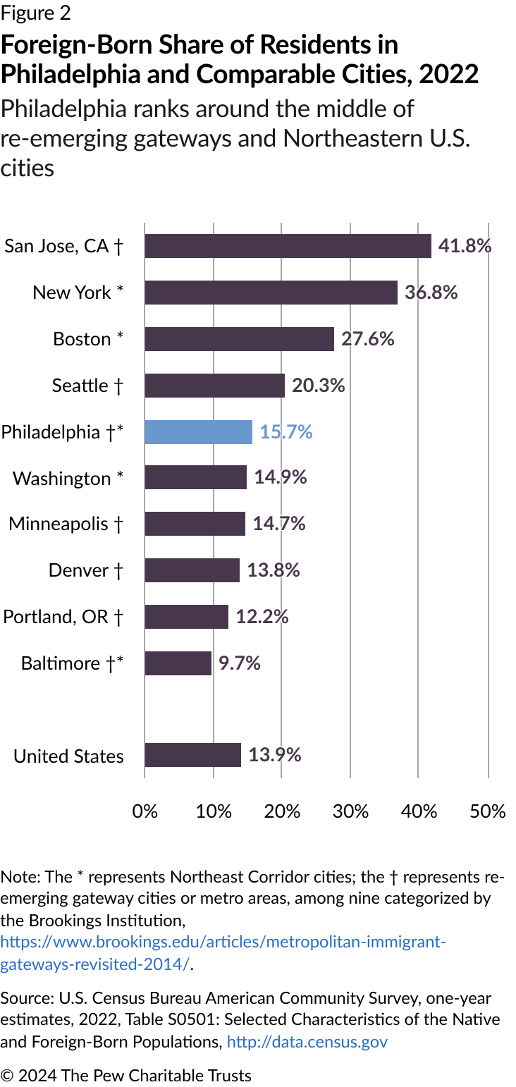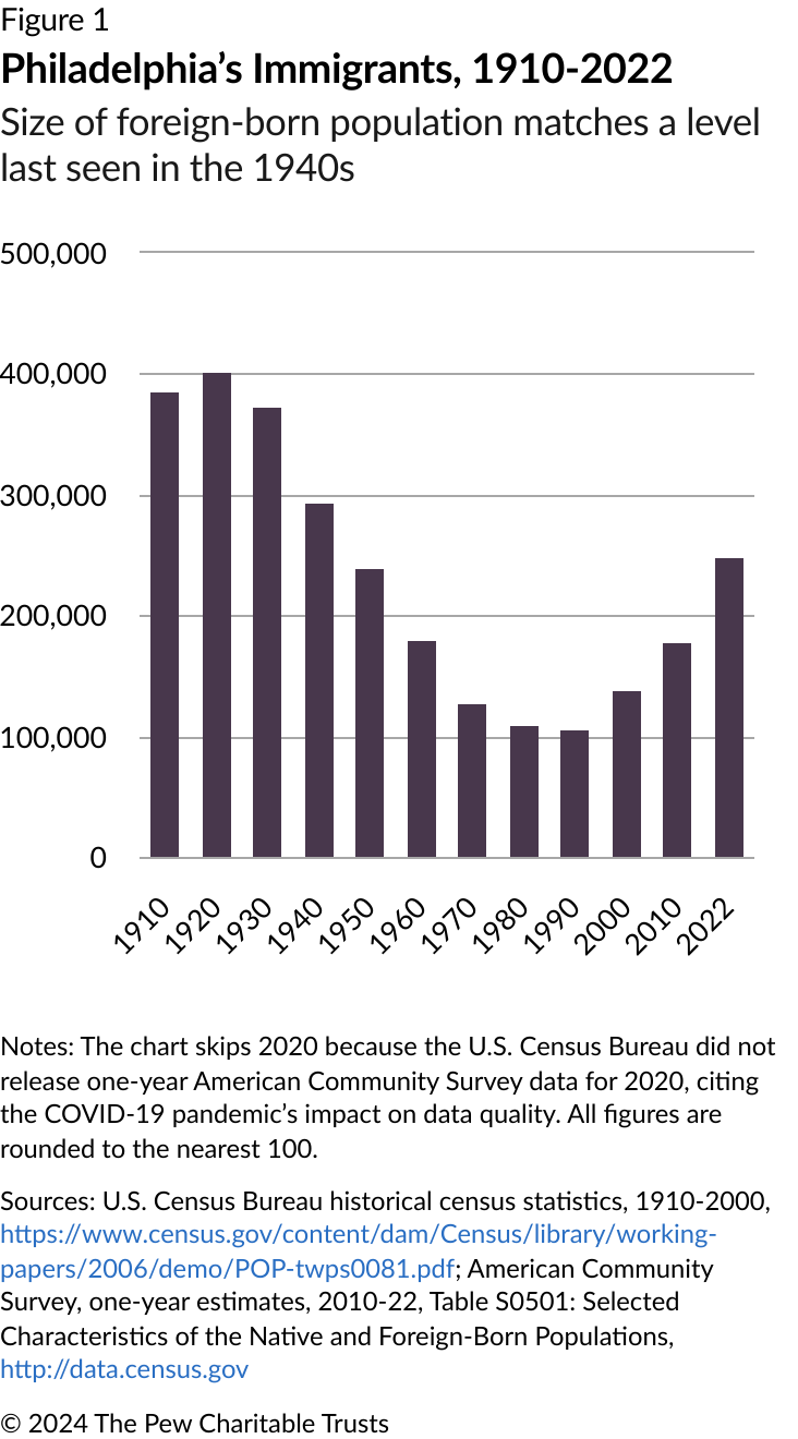 In the early 2000s, the Philadelphia metro area reemerged as a “gateway” or migration entry point for immigrants, according to a Brookings Institution analysis. While Philadelphia today still is not a top U.S. destination for people born overseas, the city’s immigrant population grew by 80% from 2000 to 2022, with immigrants in 2022 making up 15.7% of the population, the greatest percentage since 1940.