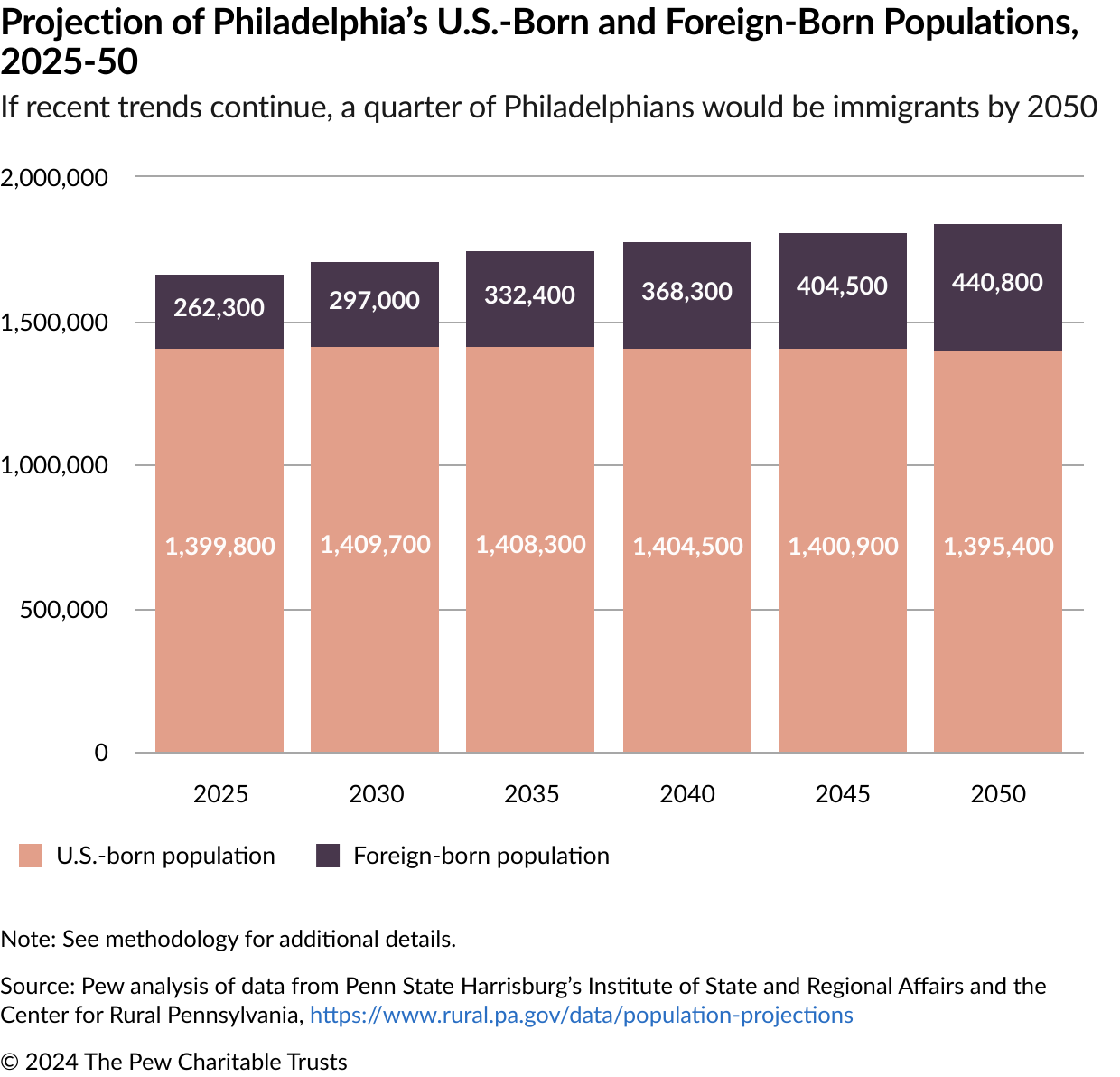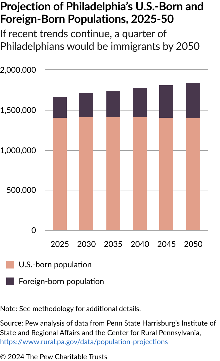 Philadelphia’s immigrant population has steadily grown over the past three decades, reaching levels not seen since the mid-20th century, even while the U.S.-born population has experienced some decline. If these trends continue, immigrants may continue to be the primary drivers of the city’s population growth in the coming years, according to The Pew Charitable Trusts’ analysis of projections by the Penn State Harrisburg’s Institute of State and Regional Affairs and the Center for Rural Pennsylvania.