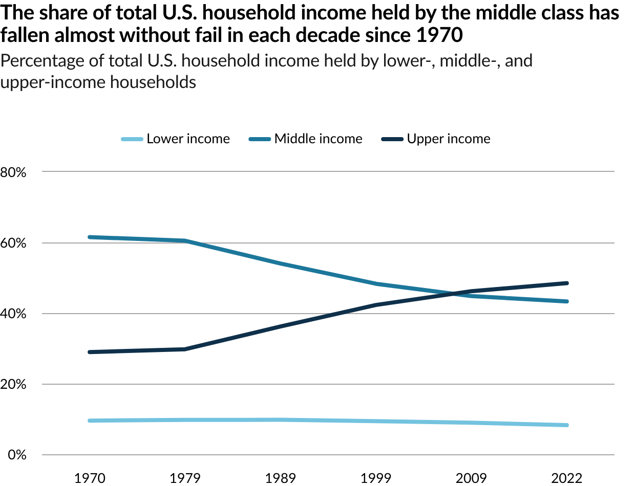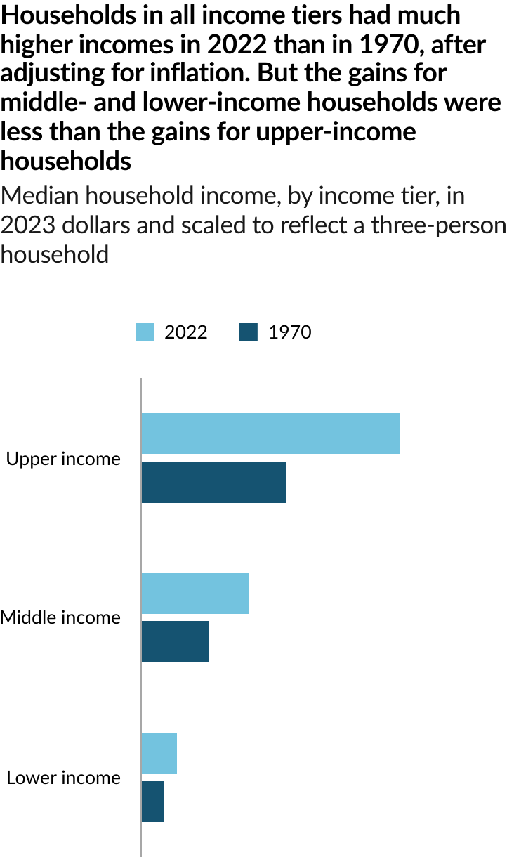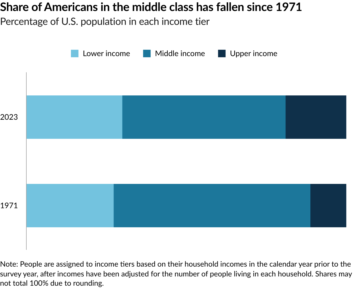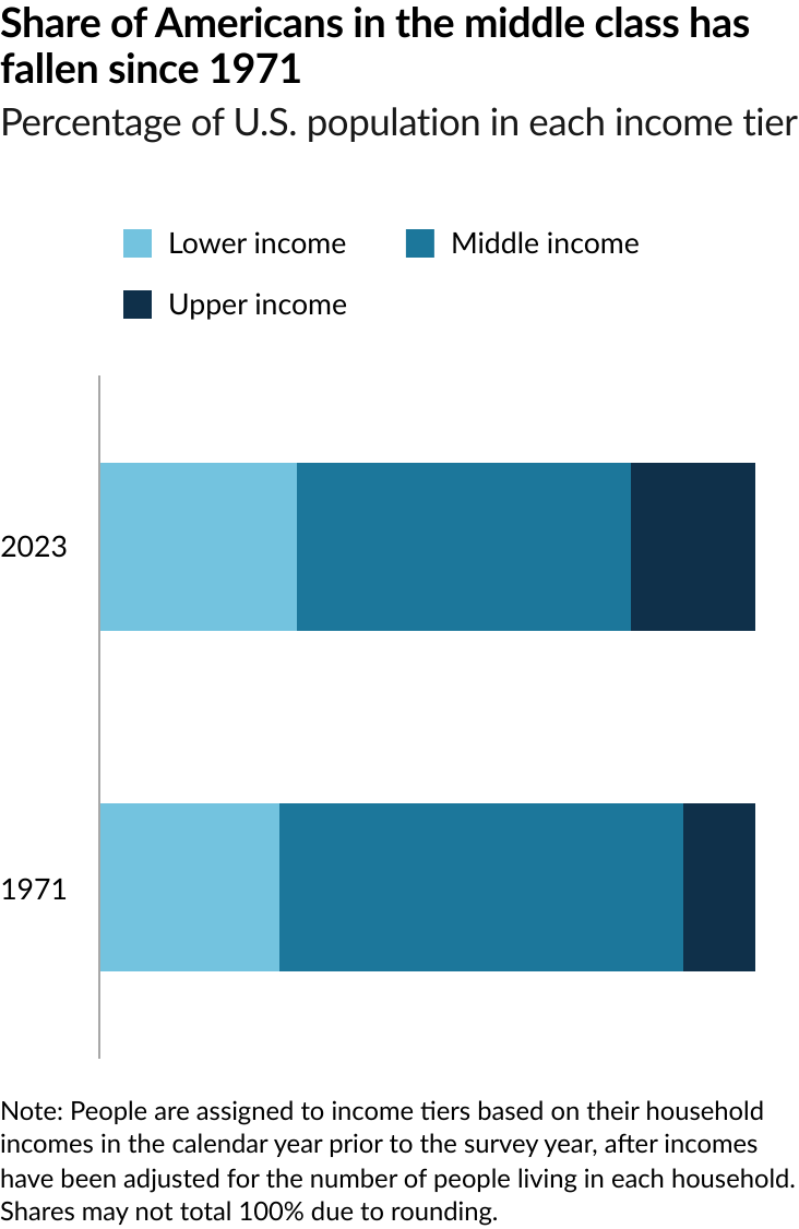 The share of Americans who are in the middle class is smaller than it used to be. In 1971, 61% of Americans lived in middle-class households. By 2023, the share had fallen to 51%, according to a new Pew Research Center analysis of government data. As a result, Americans are more apart than before financially. In a sign of overall economic progress, the increase in the share of Americans who live in upper income households was greater than the share who lived in lower income households, a sign of overall economic progress. But the growth in income for the middle class since 1970 hasn’t kept pace with the income growth for the upper tier and the share of total U.S. household income held by the middle class has plunged. Not only do a smaller share of Americans live in middle class households today, the incomes of middle-class households have also not risen as quickly as the incomes of upper-income households.