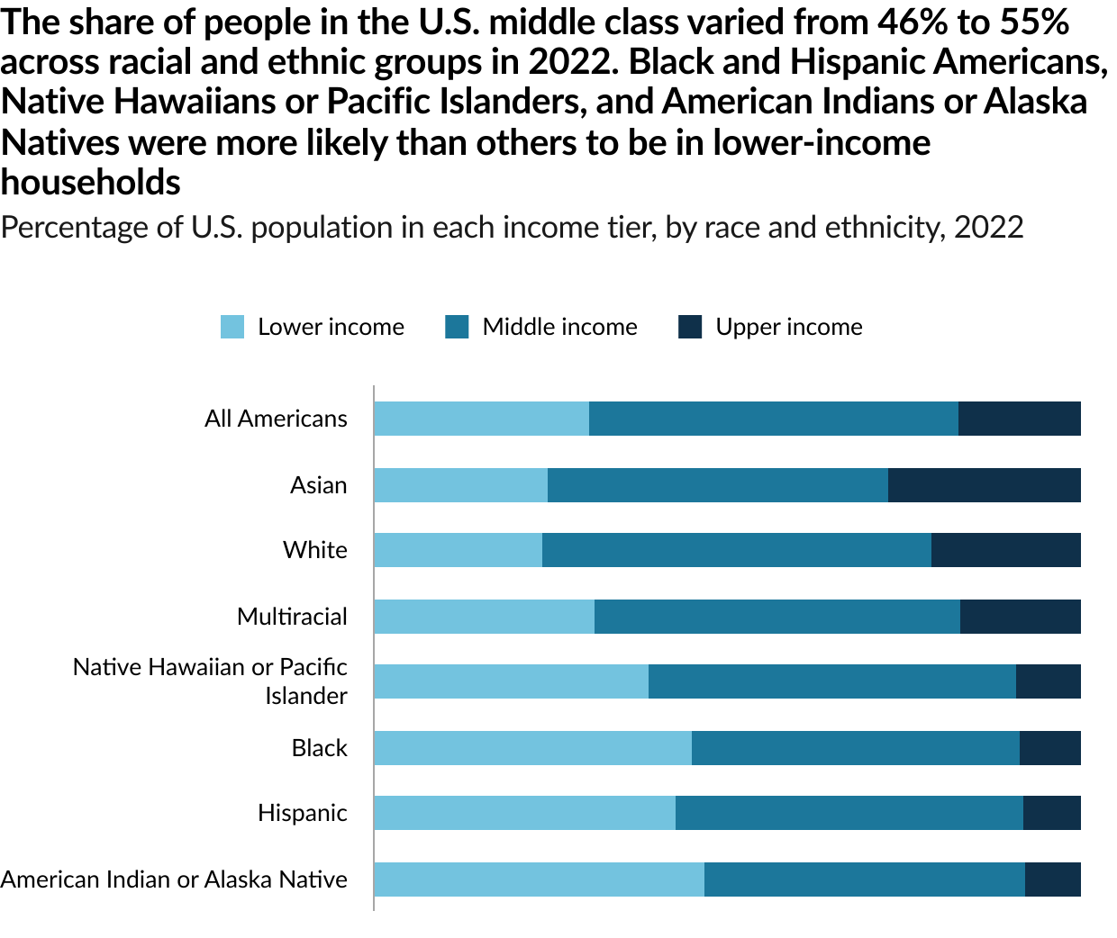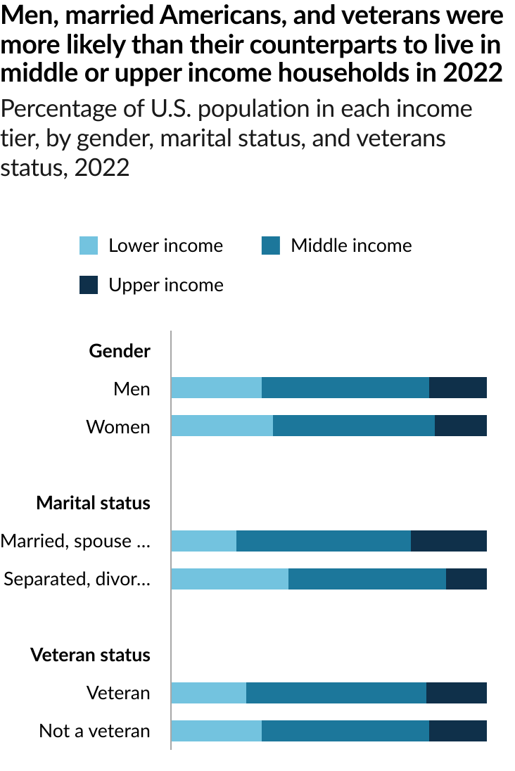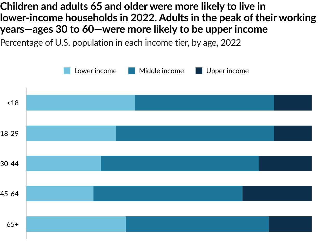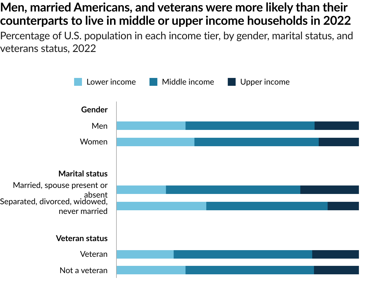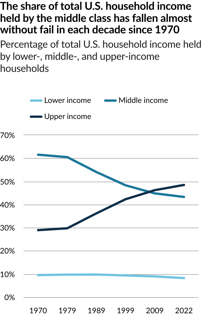 The share of Americans who are in the middle class is smaller than it used to be. In 1971, 61% of Americans lived in middle-class households. By 2023, the share had fallen to 51%, according to a new Pew Research Center analysis of government data. As a result, Americans are more apart than before financially. In a sign of overall economic progress, the increase in the share of Americans who live in upper income households was greater than the share who lived in lower income households, a sign of overall economic progress. But the growth in income for the middle class since 1970 hasn’t kept pace with the income growth for the upper tier and the share of total U.S. household income held by the middle class has plunged. Not only do a smaller share of Americans live in middle class households today, the incomes of middle-class households have also not risen as quickly as the incomes of upper-income households.
