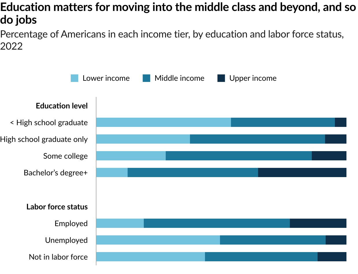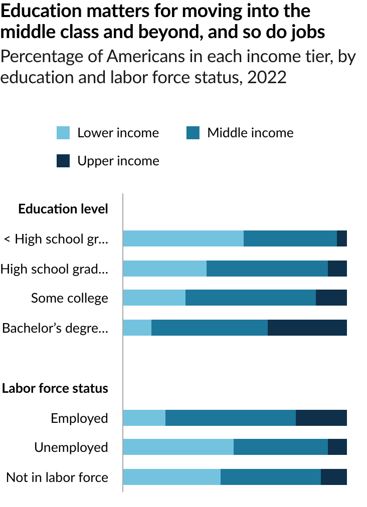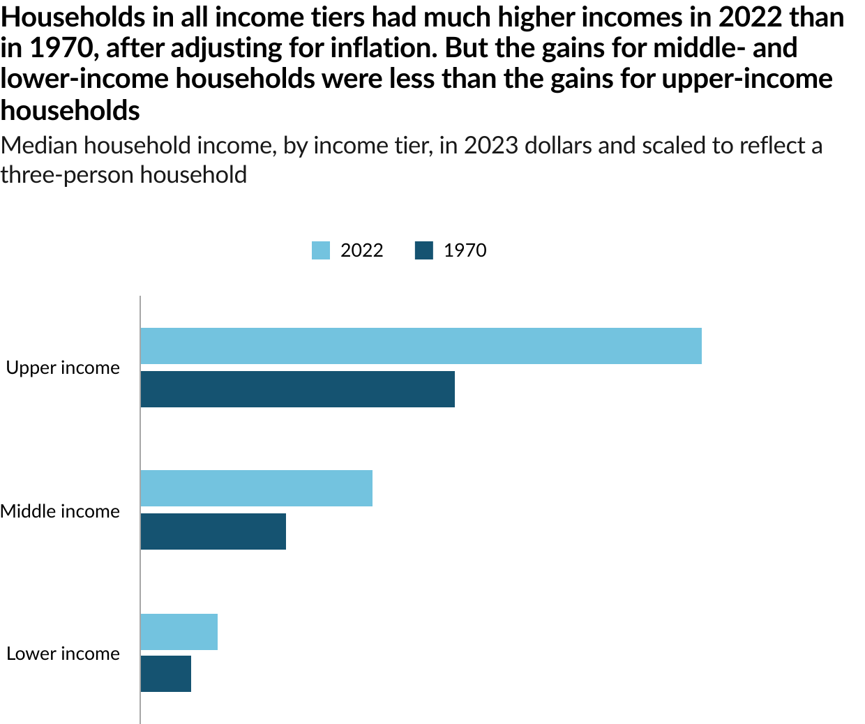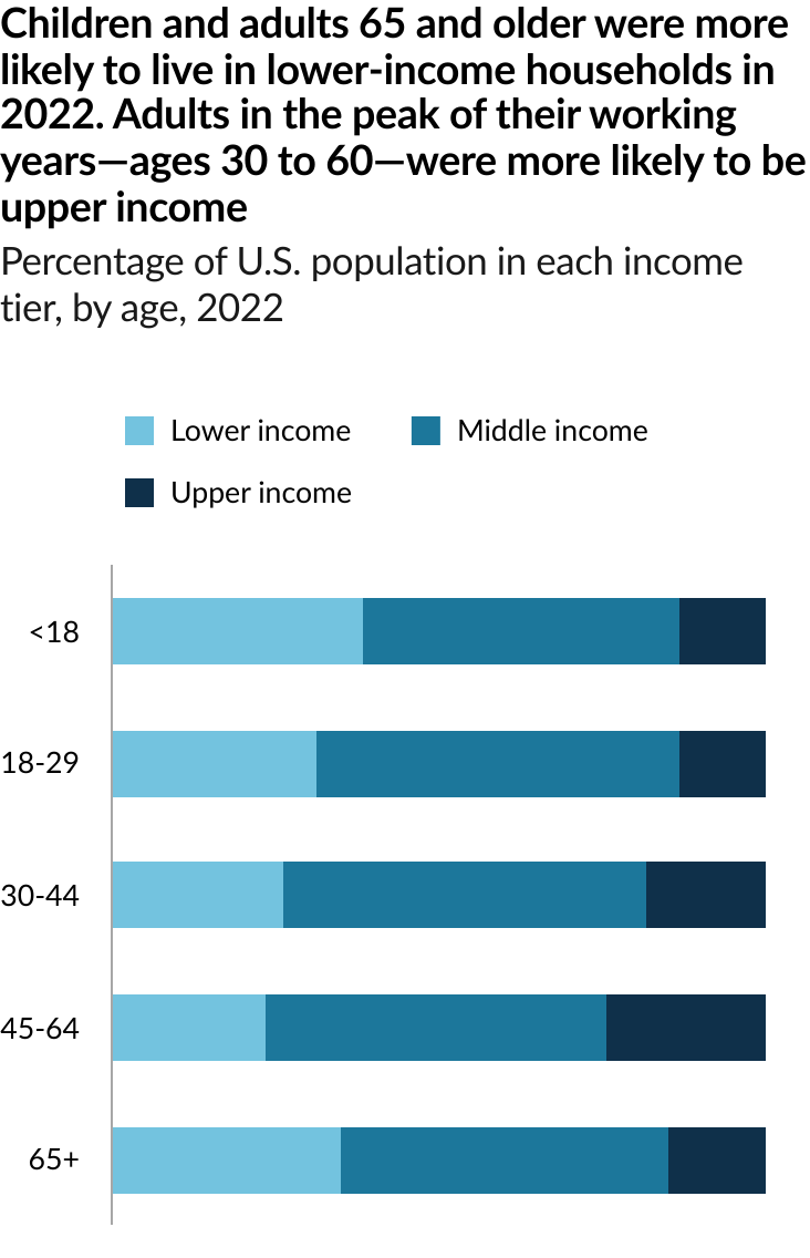 The share of Americans who are in the middle class is smaller than it used to be. In 1971, 61% of Americans lived in middle-class households. By 2023, the share had fallen to 51%, according to a new Pew Research Center analysis of government data. As a result, Americans are more apart than before financially. In a sign of overall economic progress, the increase in the share of Americans who live in upper income households was greater than the share who lived in lower income households, a sign of overall economic progress. But the growth in income for the middle class since 1970 hasn’t kept pace with the income growth for the upper tier and the share of total U.S. household income held by the middle class has plunged. Not only do a smaller share of Americans live in middle class households today, the incomes of middle-class households have also not risen as quickly as the incomes of upper-income households.